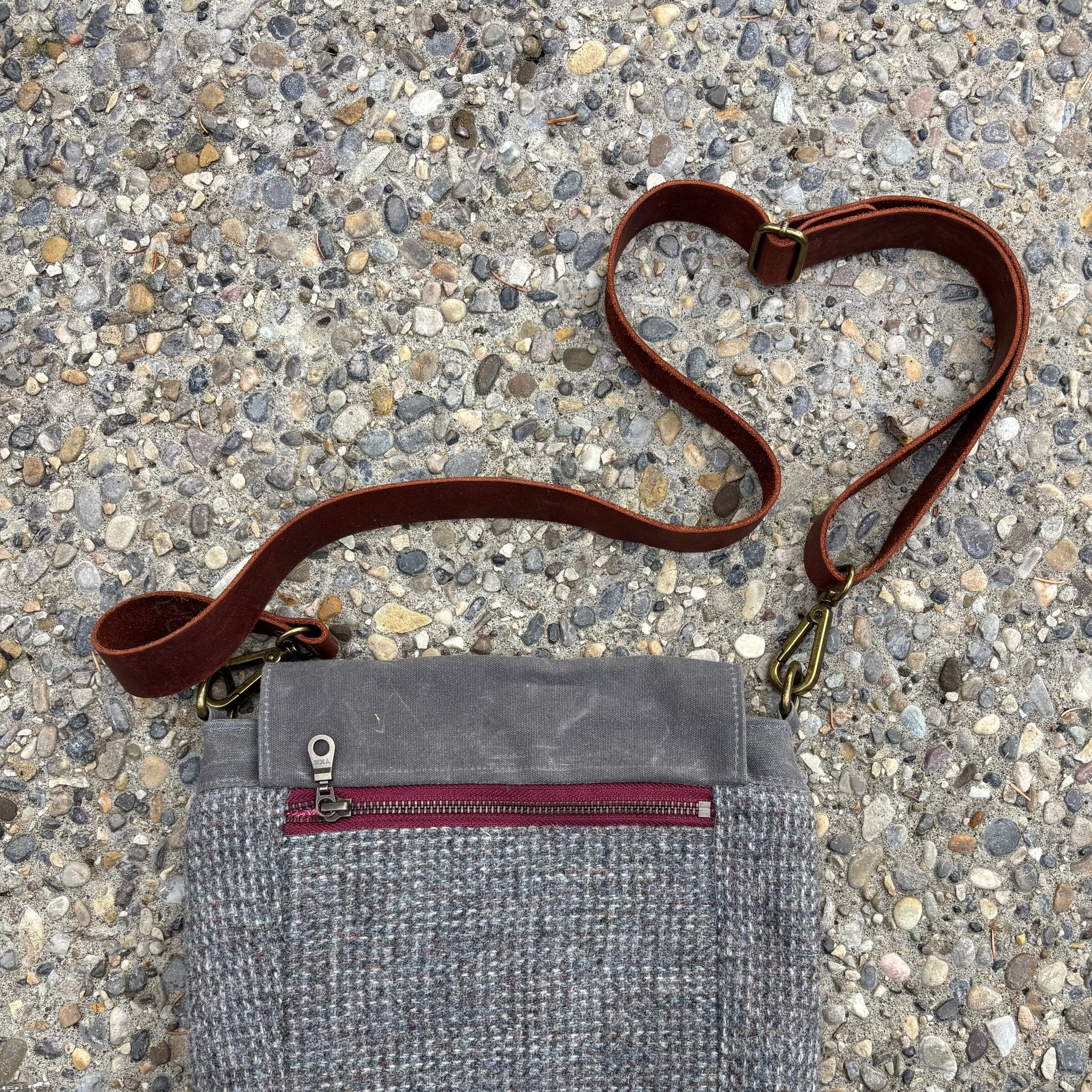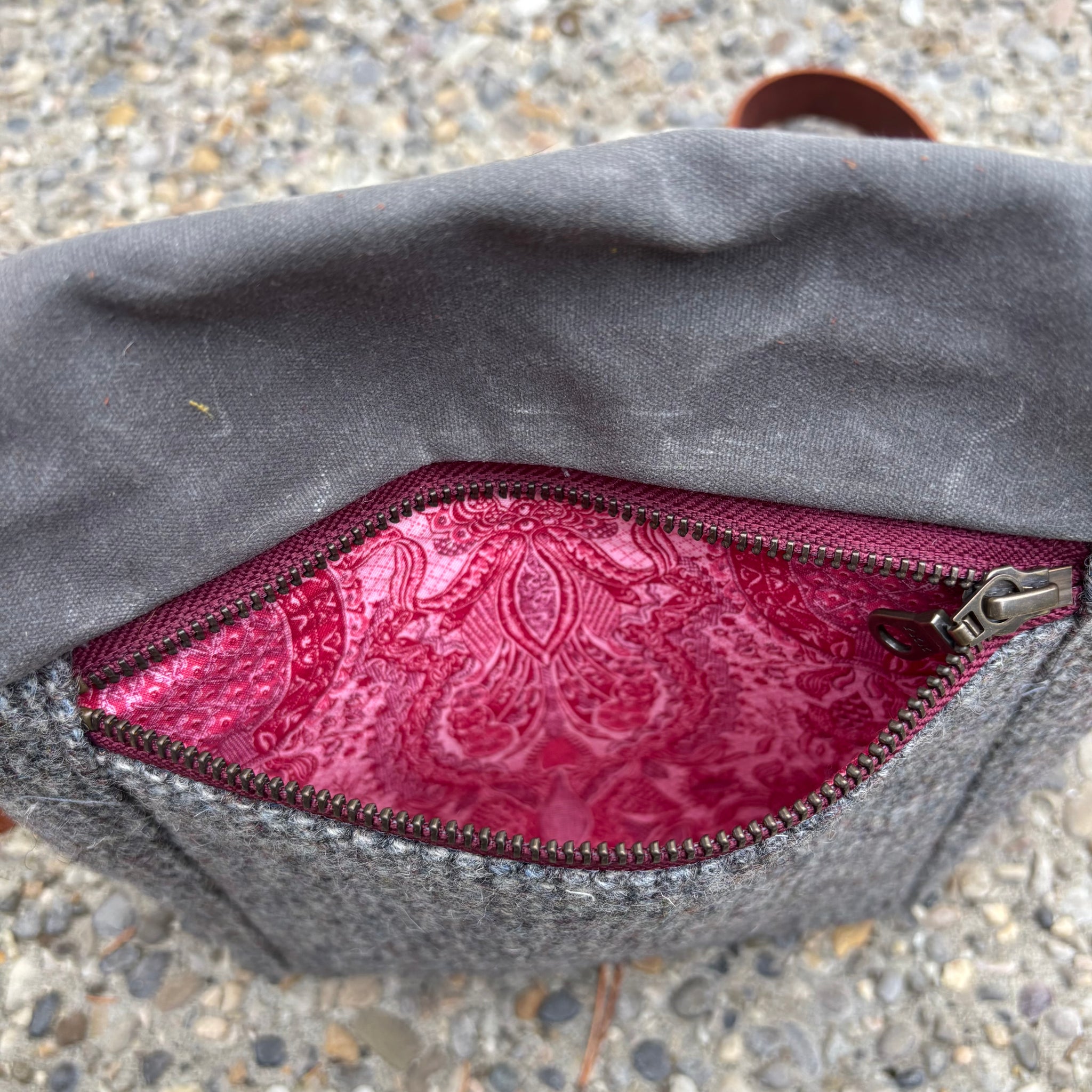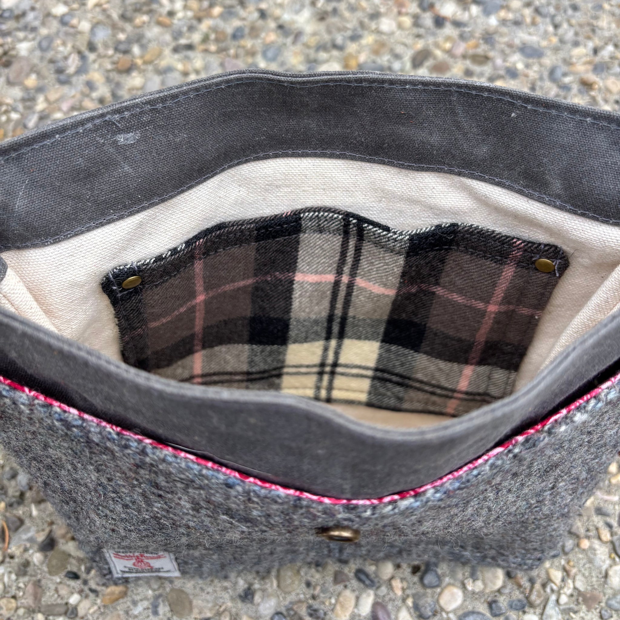 This Sequoia Satchel is a messenger-style cross body bag made using lots of waxed canvas for durability and water resistant strength. We’ve chosen some our favourite wool skirts and suit jackets to compliment the waxed canvas inside and out and we’ve even used some small kilt pieces for the inner slip pocket.
