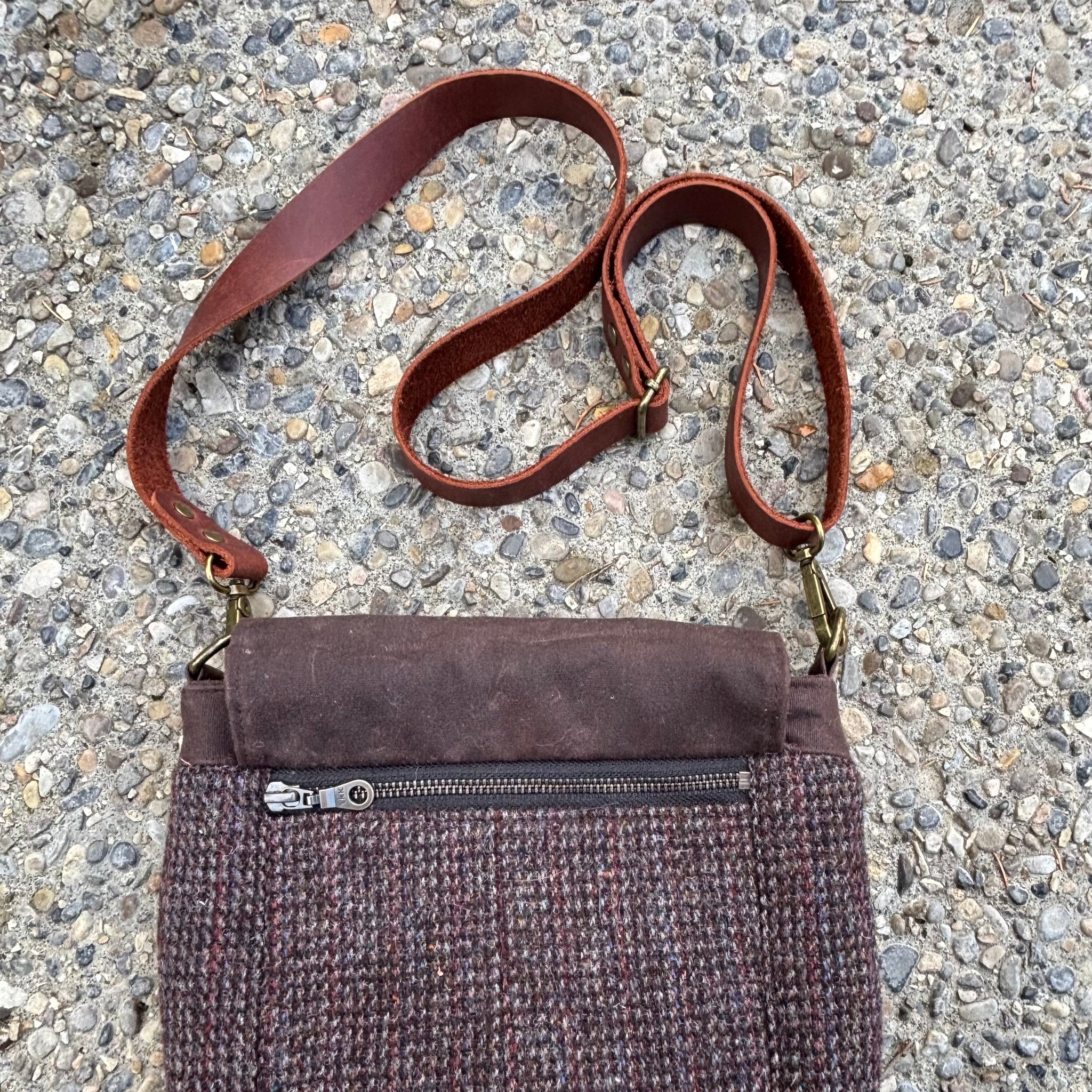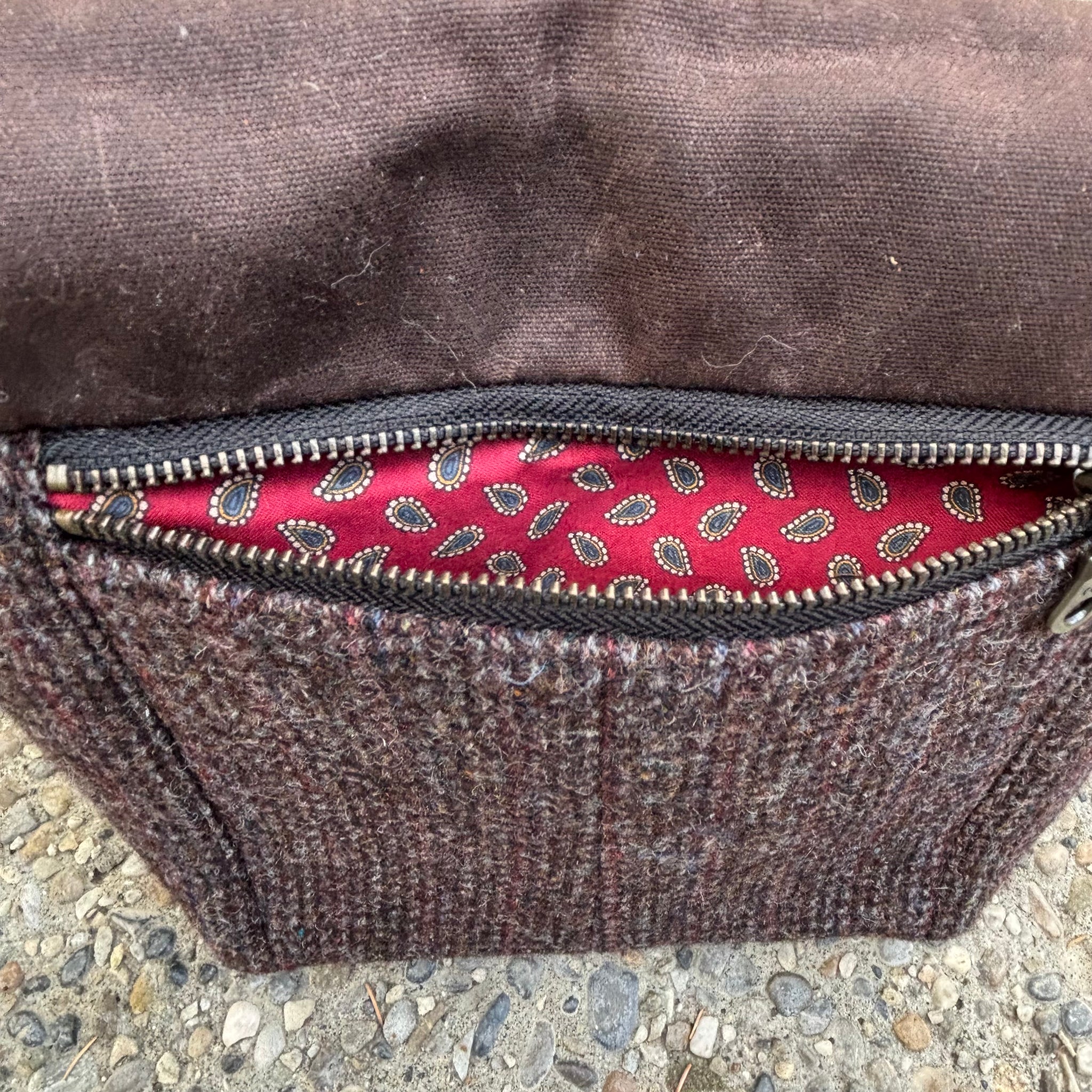 This Sequoia Satchel is a messenger-style cross body bag made using lots of waxed canvas for durability and water resistant strength. We’ve chosen some our favourite wool skirts and suit jackets to compliment the waxed canvas inside and out and we’ve even used some small kilt pieces for the inner slip pocket.