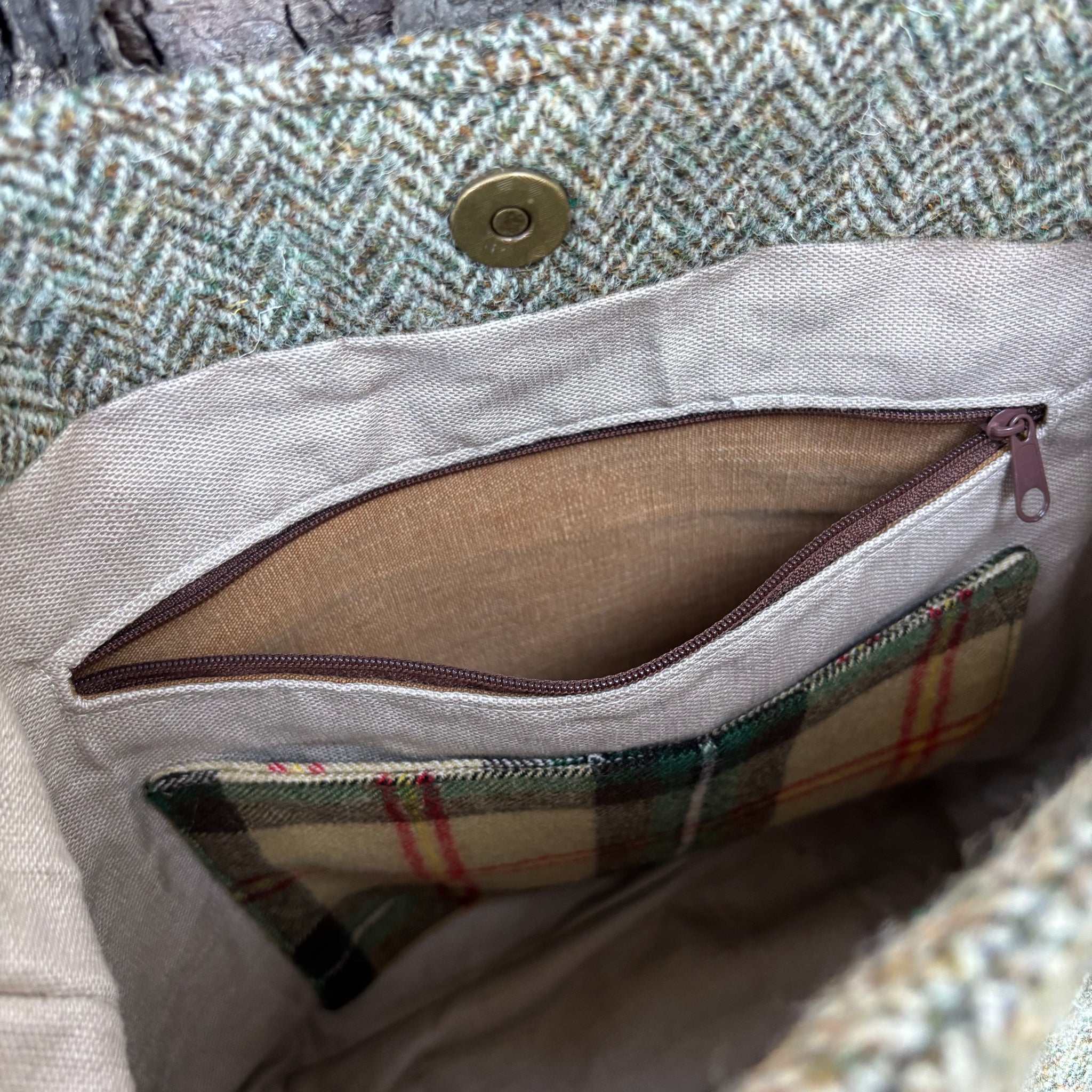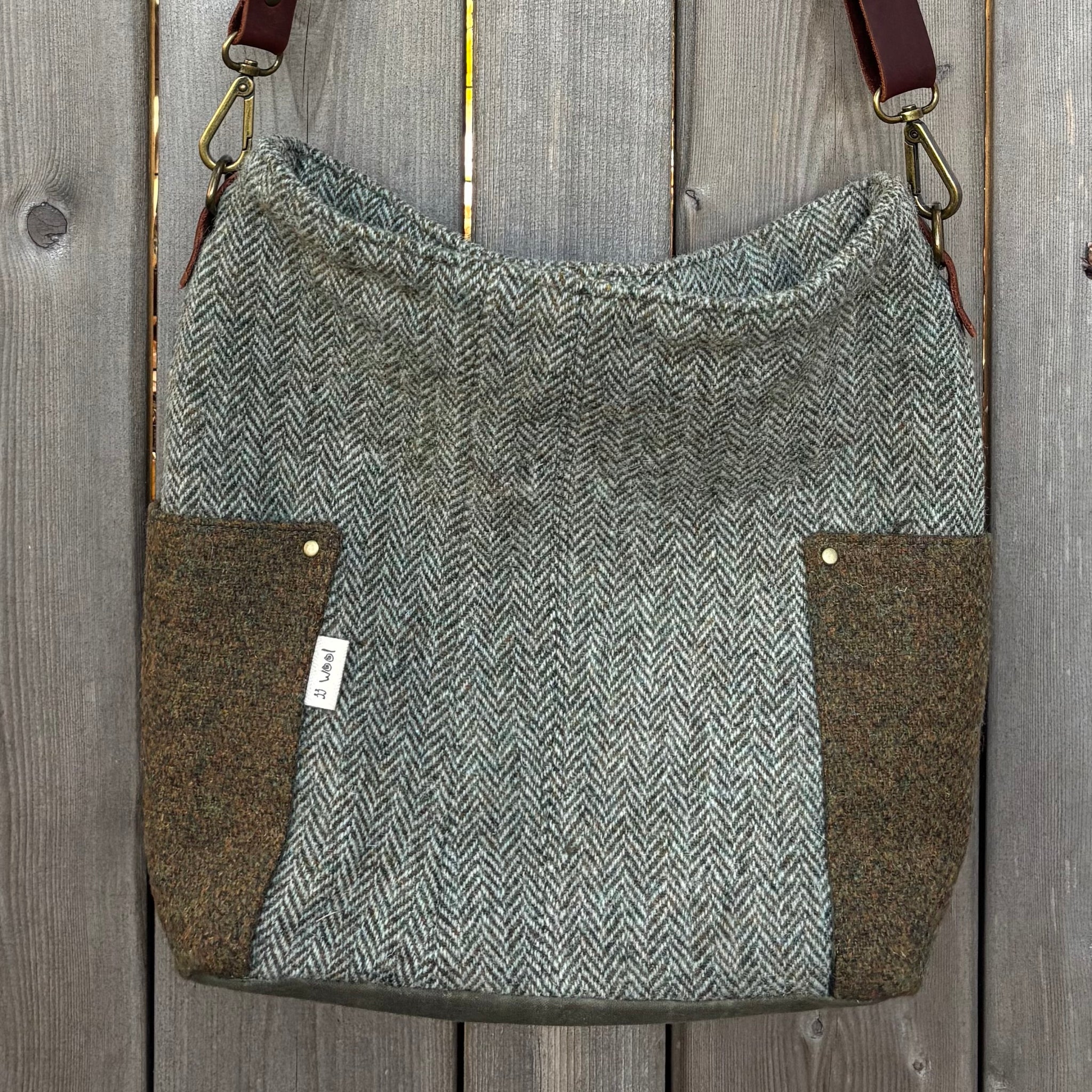 The exterior of every Compass bag is crafted from thrifted wool suit jackets, skirts or other woolly remnants. Two easy-access pockets offer quick storage, while the durable waxed canvas provides a sturdy, water resistant base. Leather tabs, rivets and durable hardware secure the gorgeous leather strap, adding timeless detail. Inside, the bag is thoughtfully designed for your daily essentials—wallet, sunglasses, and a small book—with a zip pocket lined with patterned material and a slip pocket from wool kilts. Versatile and stylish, this crossbody bag is ready for your everyday adventures.