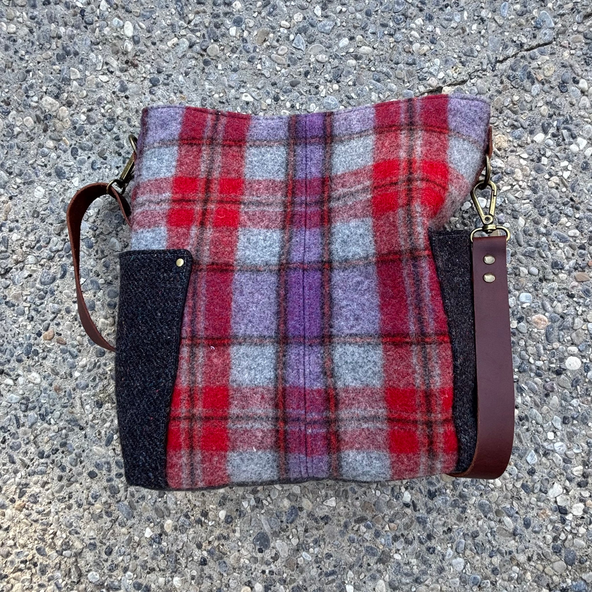 The exterior of every Compass bag is crafted from thrifted wool suit jackets, skirts or other woolly remnants. Two easy-access pockets offer quick storage, while the durable waxed canvas provides a sturdy, water resistant base. Leather tabs, rivets and durable hardware secure the gorgeous leather strap, adding timeless detail. Inside, the bag is thoughtfully designed for your daily essentials—wallet, sunglasses, and a small book—with a zip pocket lined with patterned material and a slip pocket from wool kilts. Versatile and stylish, this crossbody bag is ready for your everyday adventures.