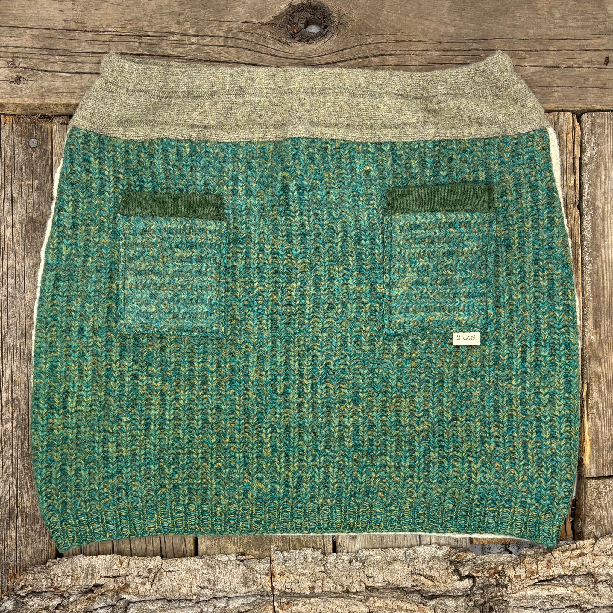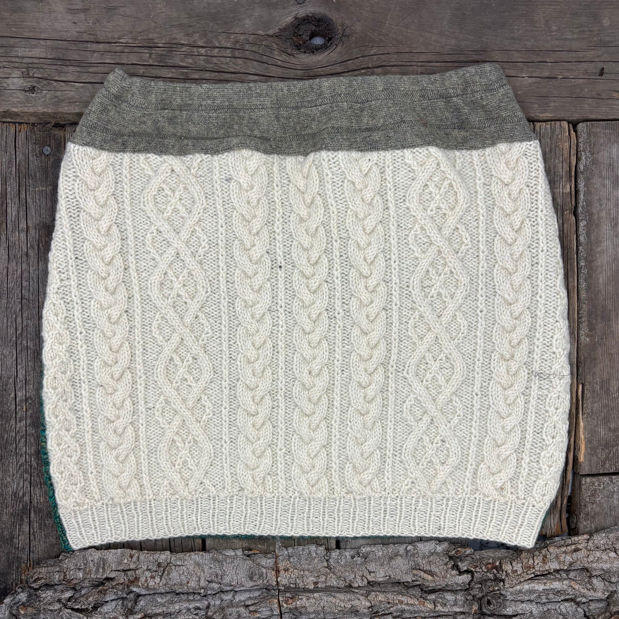 The front of this skirt is a handknit cream Irish cable knit and the back is a green/gold chunky rib knit. But, hold your horses! There are two back patch pockets instead of the usual single.