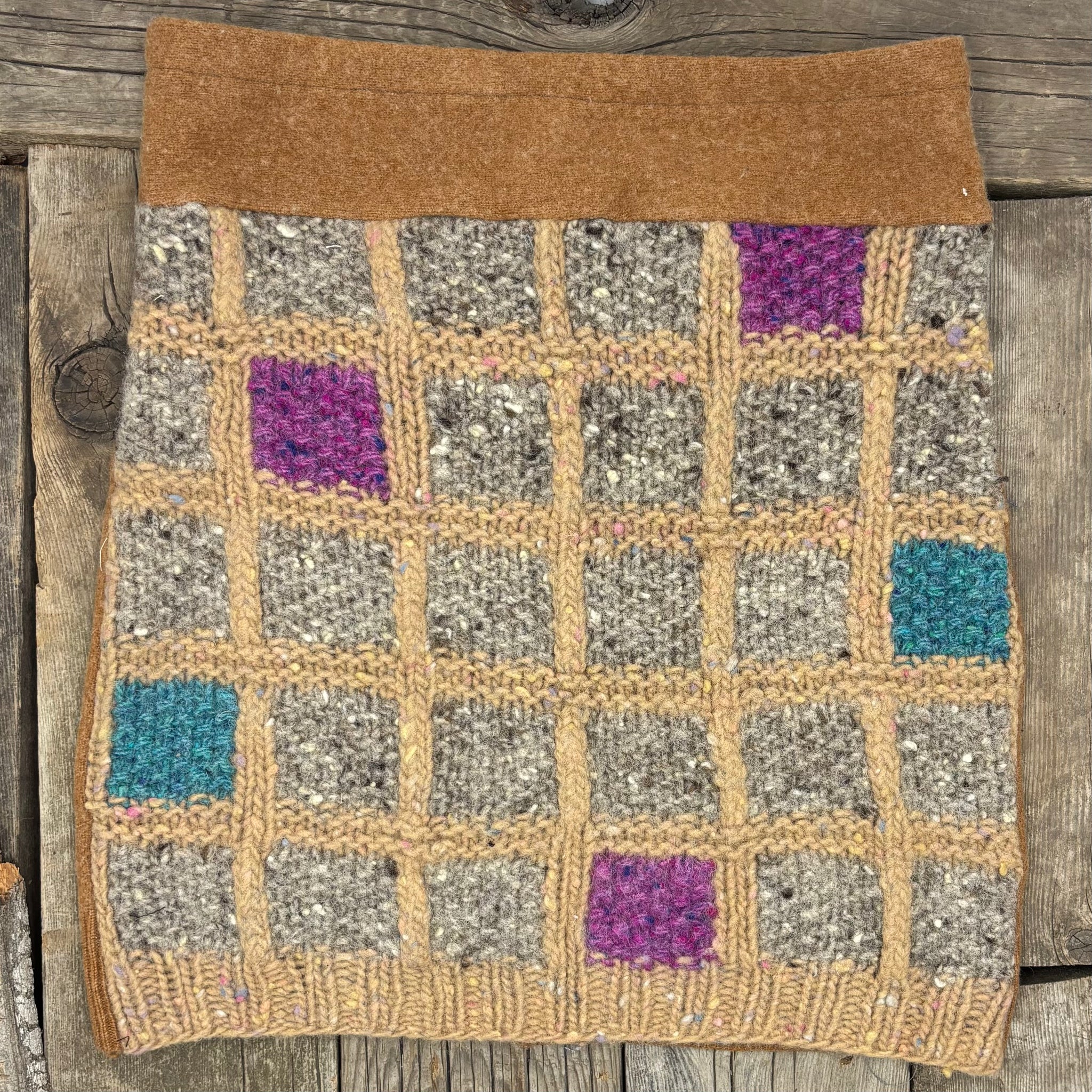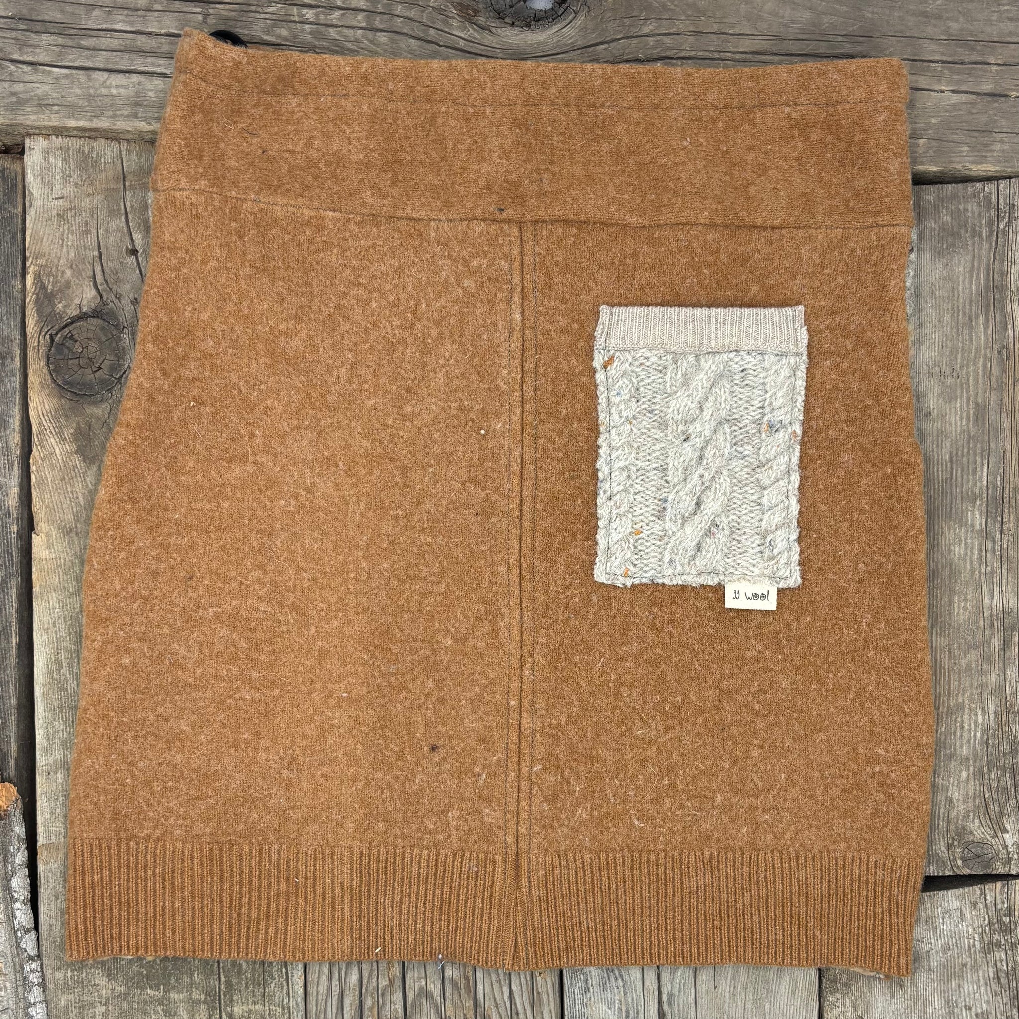 This skirt combines one of the most unusually textured sweaters we've found on the front, with a felted golden wool sweater on the back. Handy patch pocket on back. A truly unique piece.