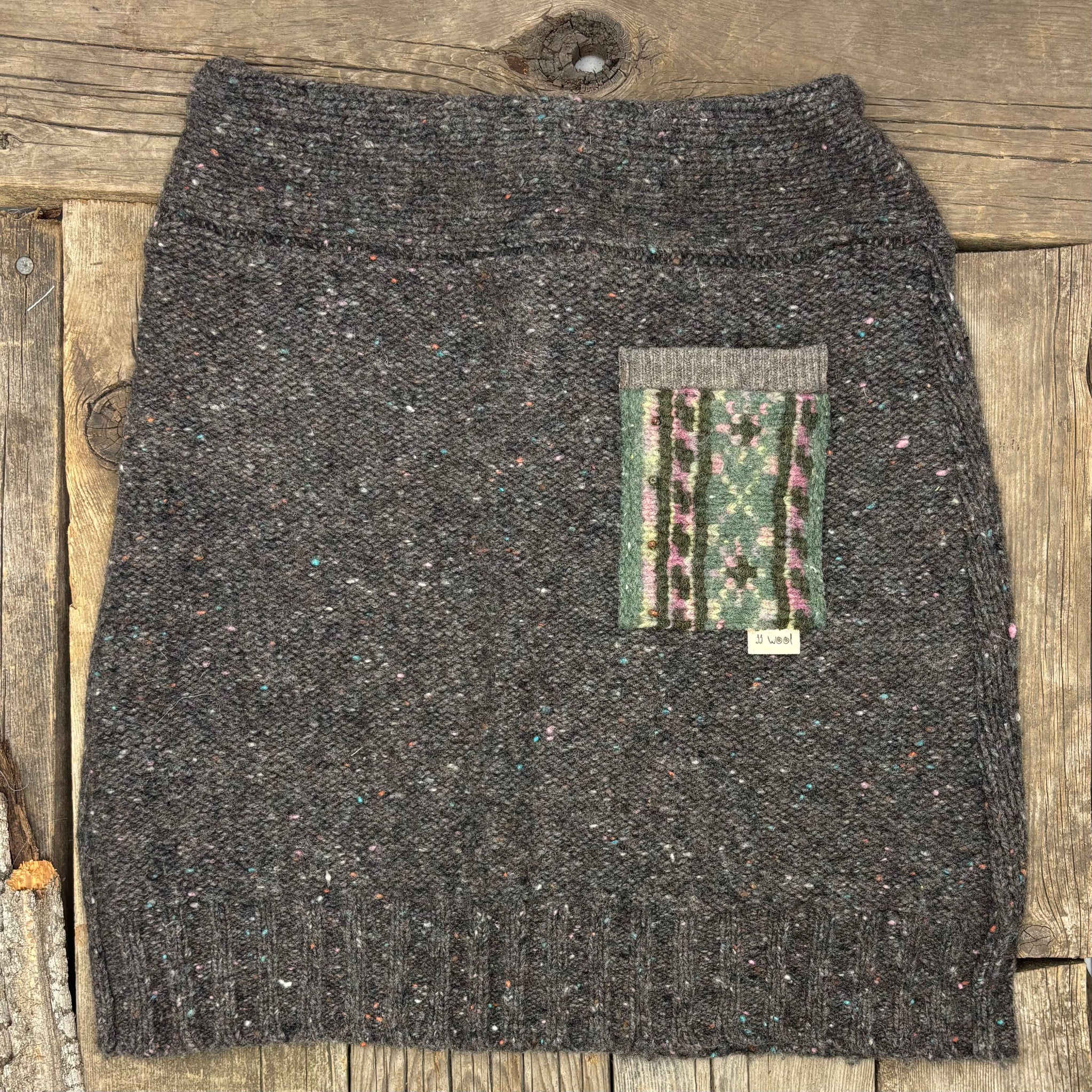 This skirt uses an Irish cable knit cardigan on the front and back. The brown wool is speckled with pastel "dots". Looks like Donegal tweed. There is a coordinating handy pocket on the back. Worn just below the waist, it tends to fall a couple of inches above the knee, shorter if you’re tall, and the drawstring waistband is adjustable.