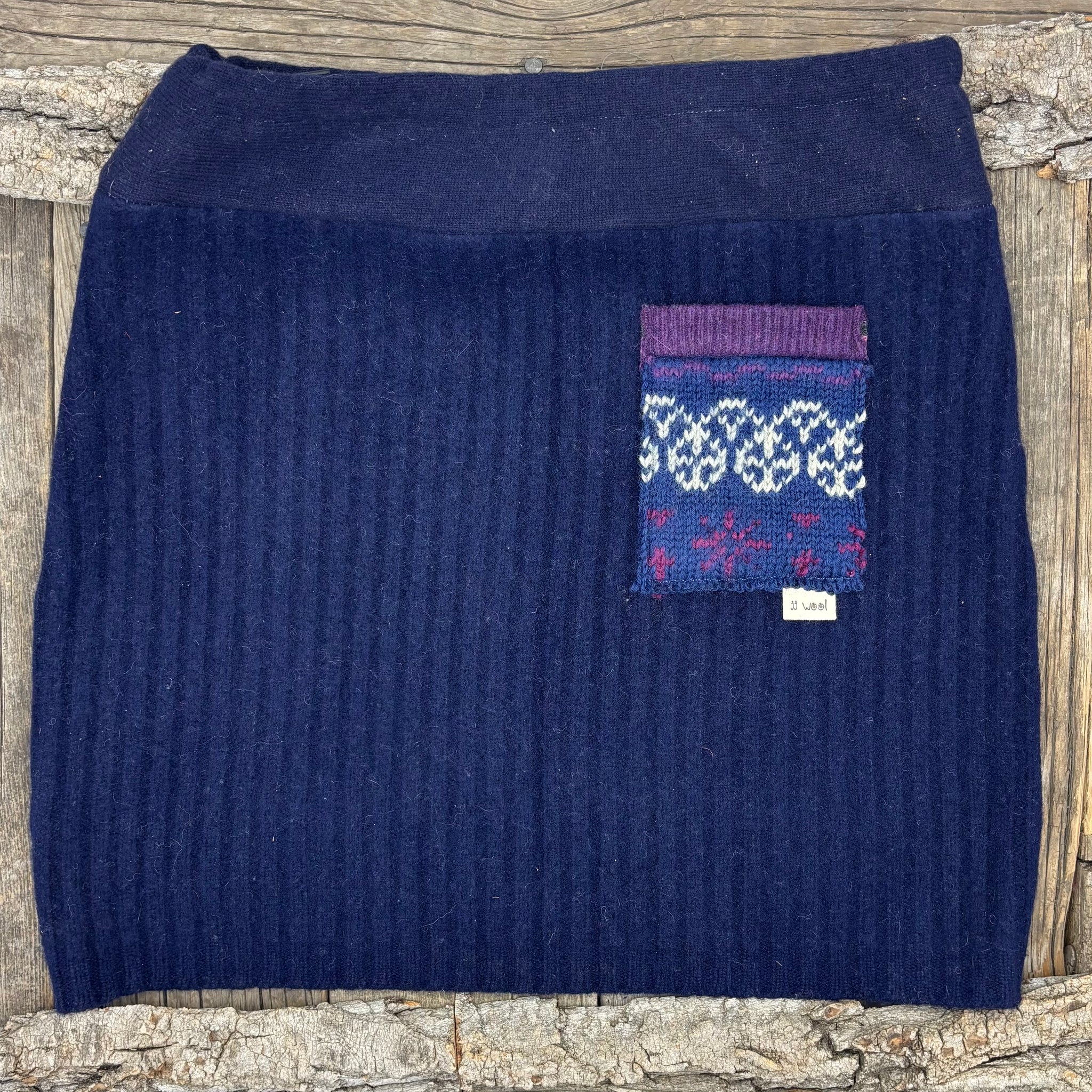 The front of this skirt is from a woolly deep blue and purpley patterned knit sweater. The back is a navy rib knit sweater with the signature handy pocket. Worn just below the waist, it tends to fall a couple of inches above the knee, shorter if you’re tall, and the drawstring waistband is adjustable.