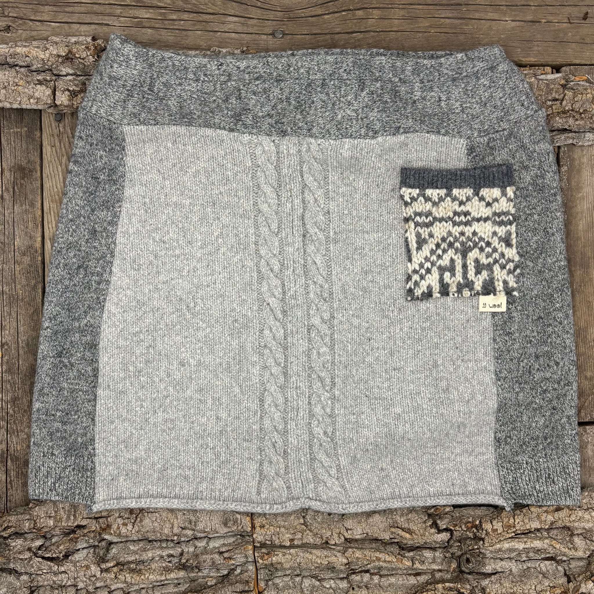 This panelled skirt uses a pale grey Irish cabled sweater for the two center panels and a plain heathered grey sweater on the sides . The chunky knit coordinating pocket looks good worn in the front or back. A true neutral.
