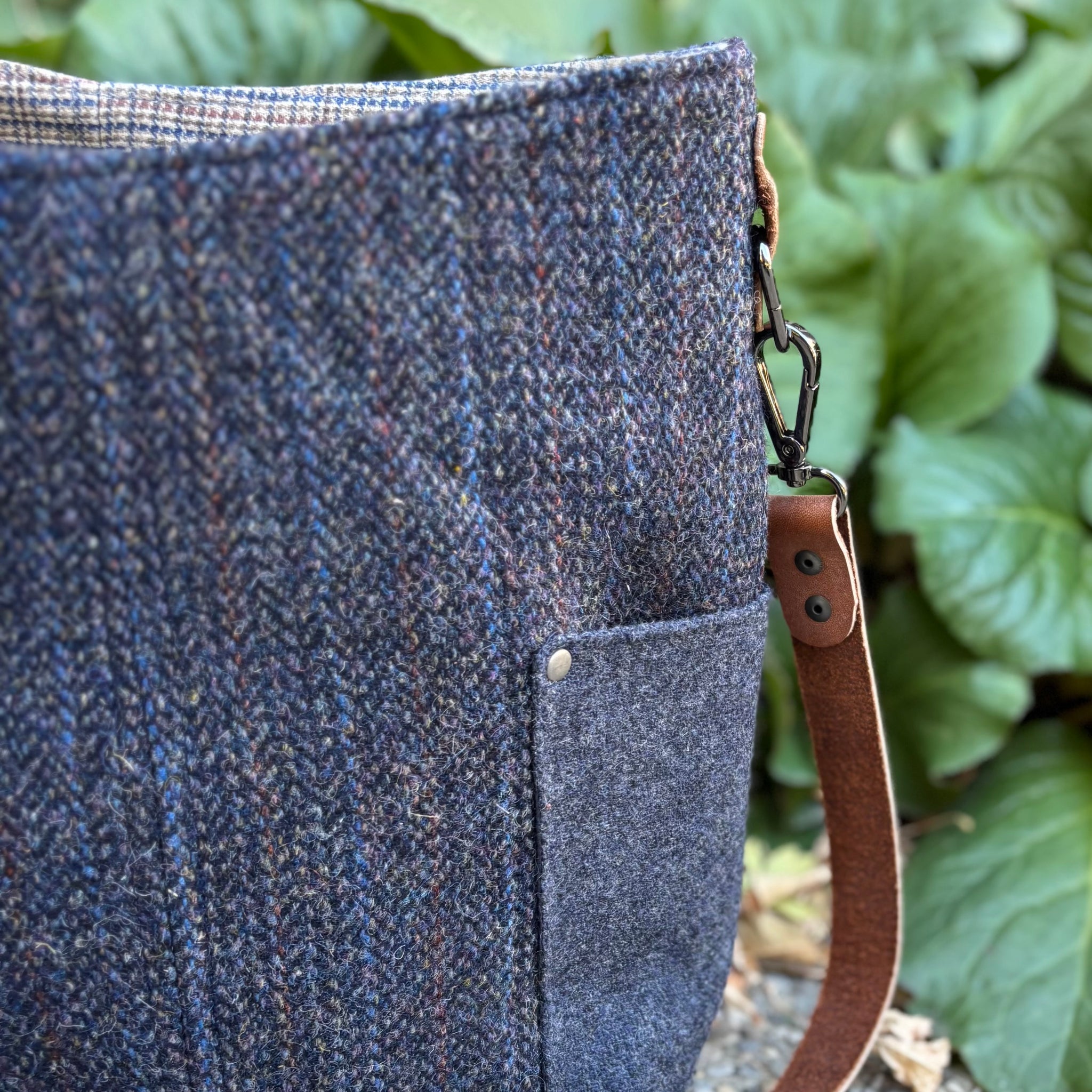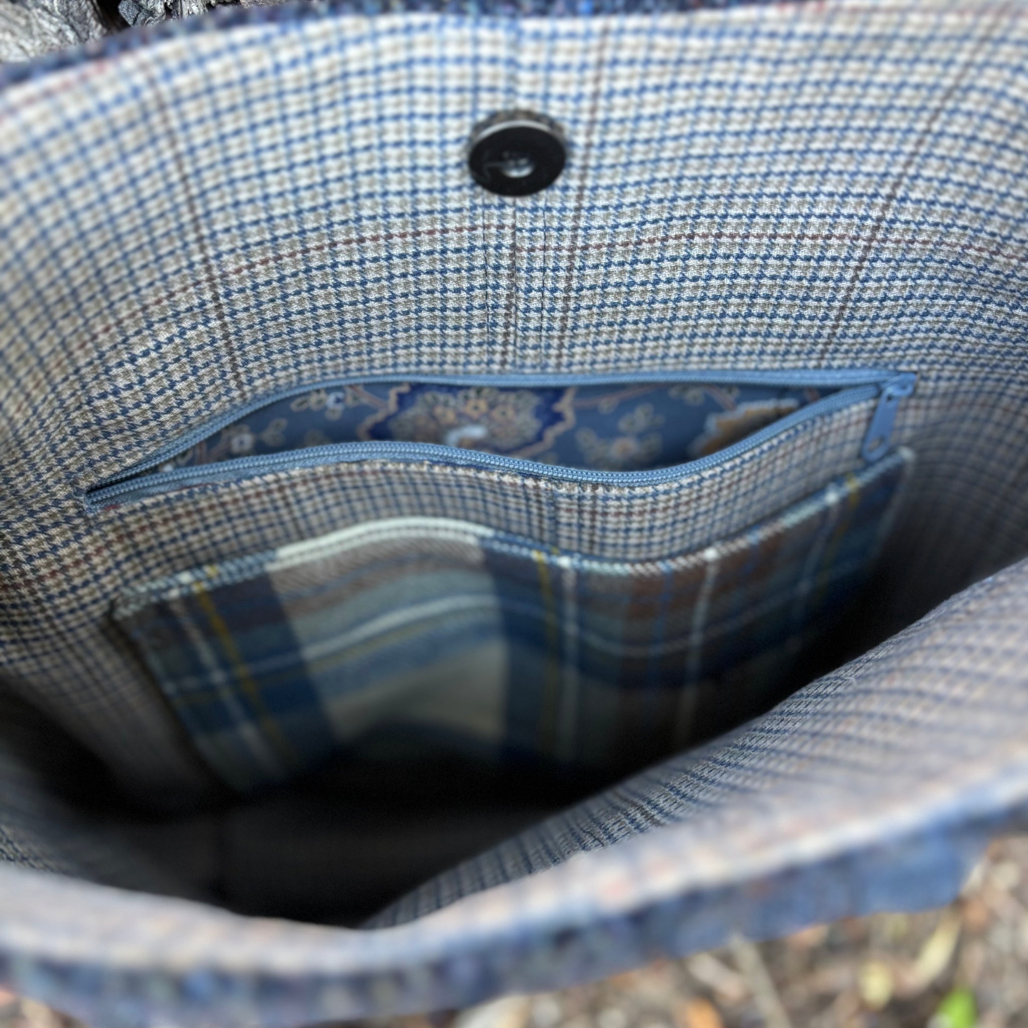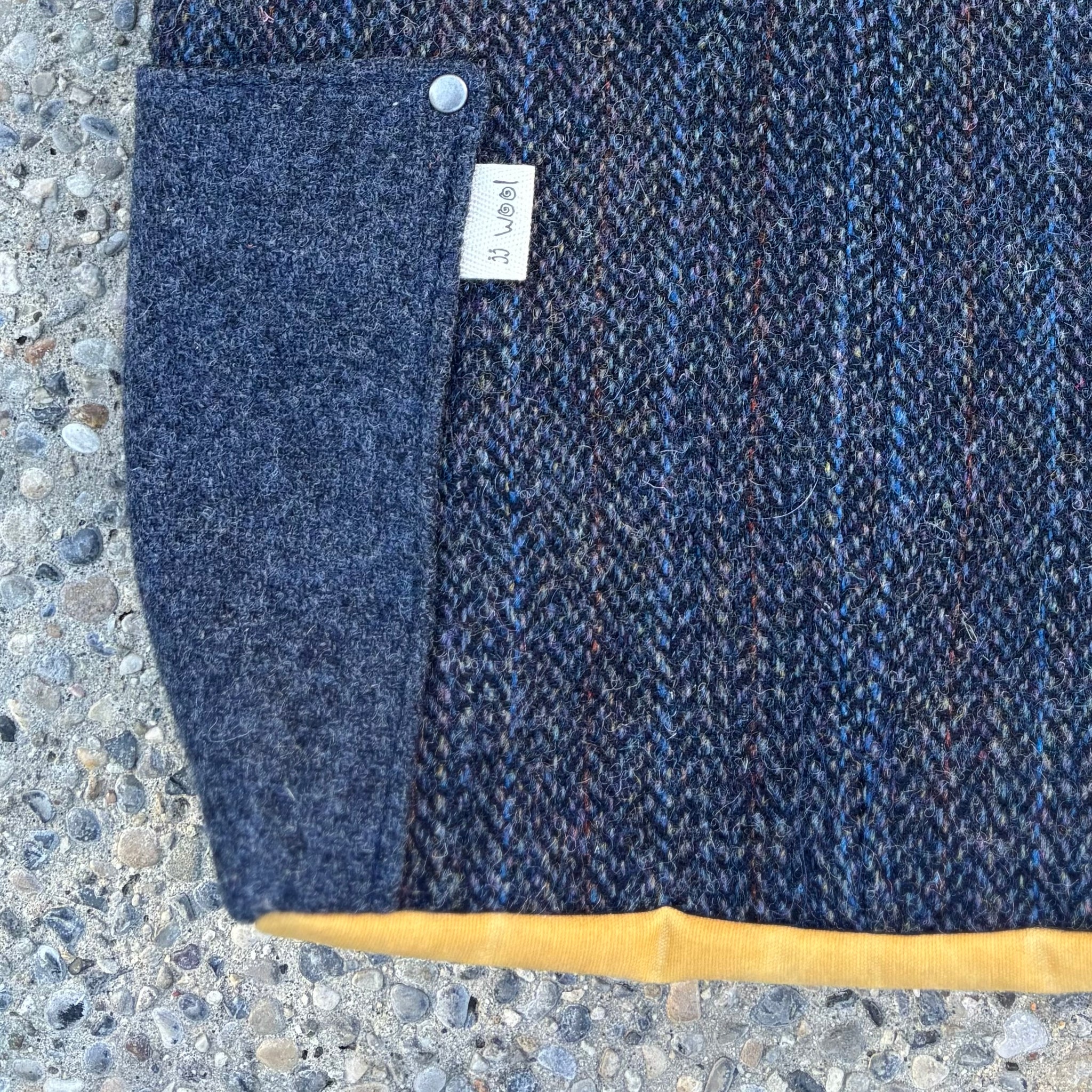 The exterior of every Compass bag is crafted from thrifted wool suit jackets, skirts or other woolly remnants. Two easy-access pockets offer quick storage, while the durable waxed canvas provides a sturdy, water resistant base. Leather tabs, rivets and durable hardware secure the gorgeous leather strap, adding timeless detail. Inside, the bag is thoughtfully designed for your daily essentials—wallet, sunglasses, and a small book—with a zip pocket lined with patterned material and a slip pocket from wool kilts. Versatile and stylish, this crossbody bag is ready for your everyday adventures.