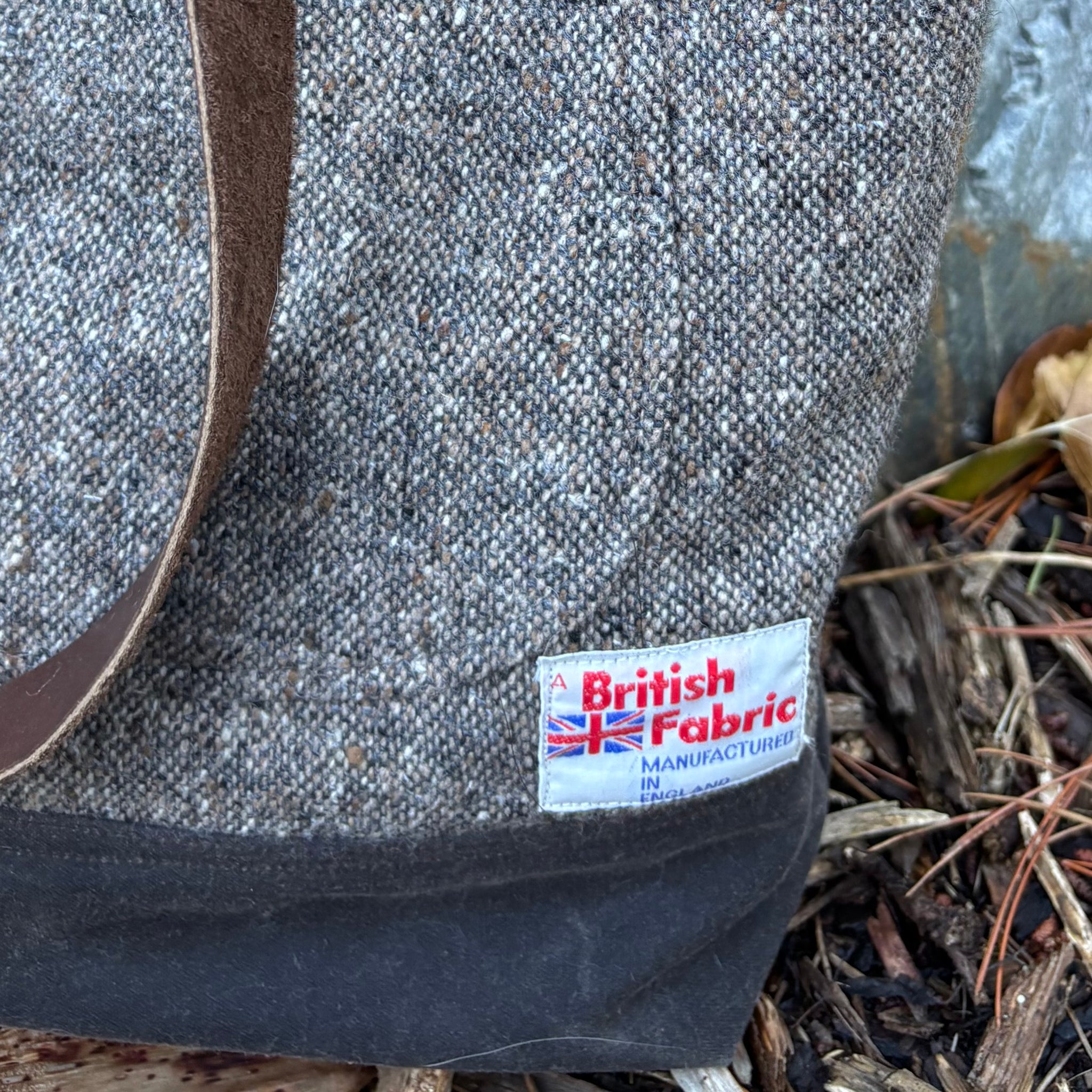 The main body of the bag is created using two different wool suit jackets. They often incorporate a pocket from each suit jacket. The lining is a souvenir tea towel with a 7.5” zippered pocket. The top zipper ensures everything stays inside. The 1” leather straps are riveted to the top edge and the envelope style base is a waxed canvas.