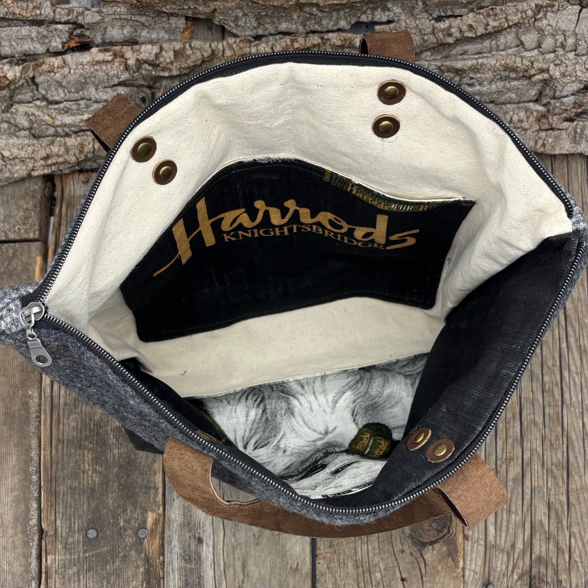 The main body of the bag is created using two different wool suit jackets. They often incorporate a pocket from each suit jacket. The lining is a souvenir tea towel with a 7.5” zippered pocket. The top zipper ensures everything stays inside. The 1” leather straps are riveted to the top edge and the envelope style base is a waxed canvas.