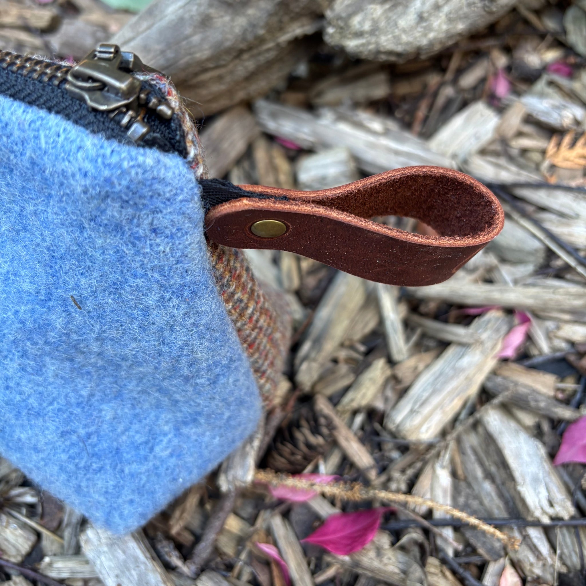 This medium-sized zippered case is made using material from scarves or wool shirts or wool suit jackets or maybe  even a wool blanket. The lining is made using souvenir tea towels from all over the world. To keep everything inside we used a zipper and attached a leather pull.
