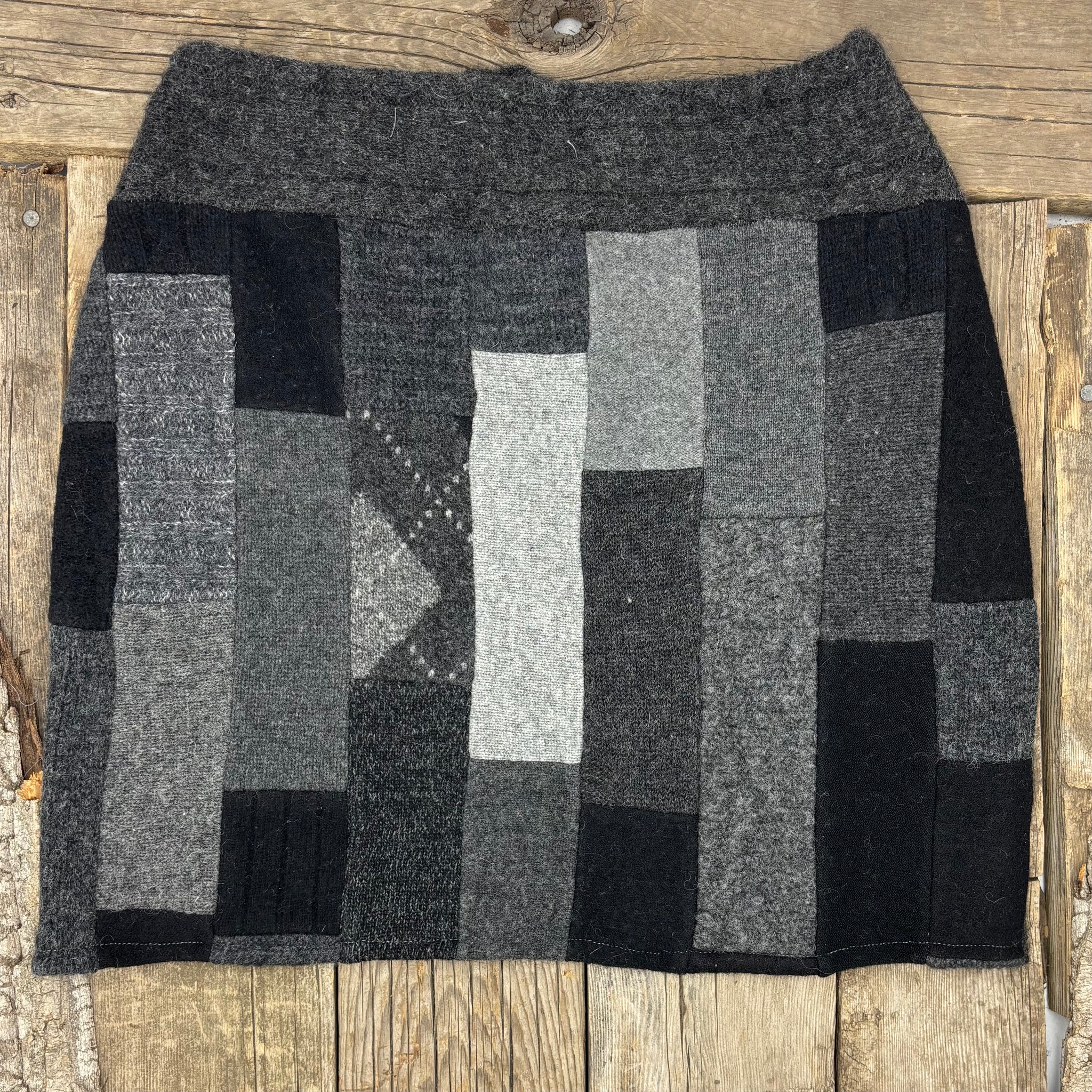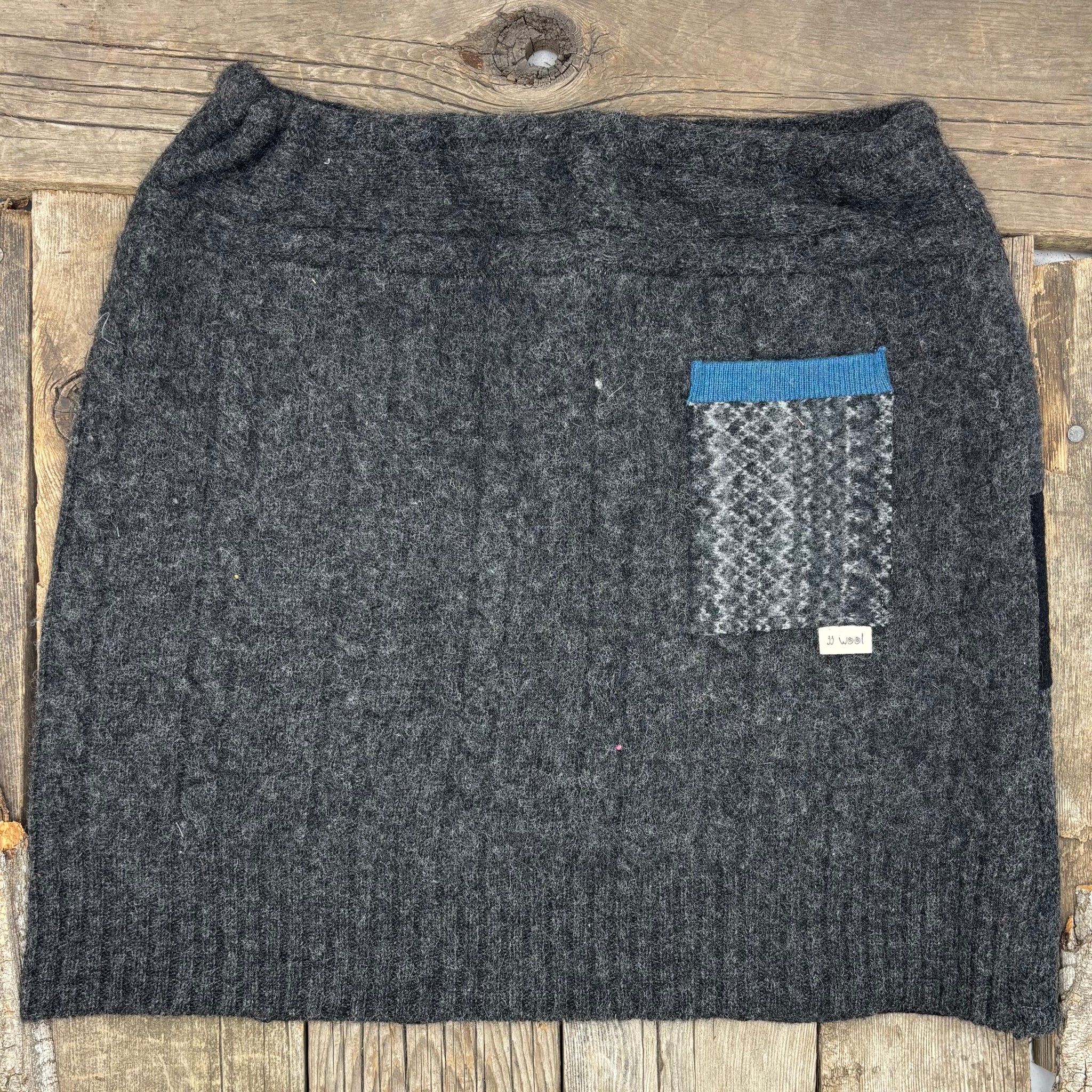 This skirt uses a selection of darker grey and black sweaters. The strips are arranged vertically. The back is made from a charcoal cabled knit along with the handy back pocket trimmed in blue. A wardrobe basic.