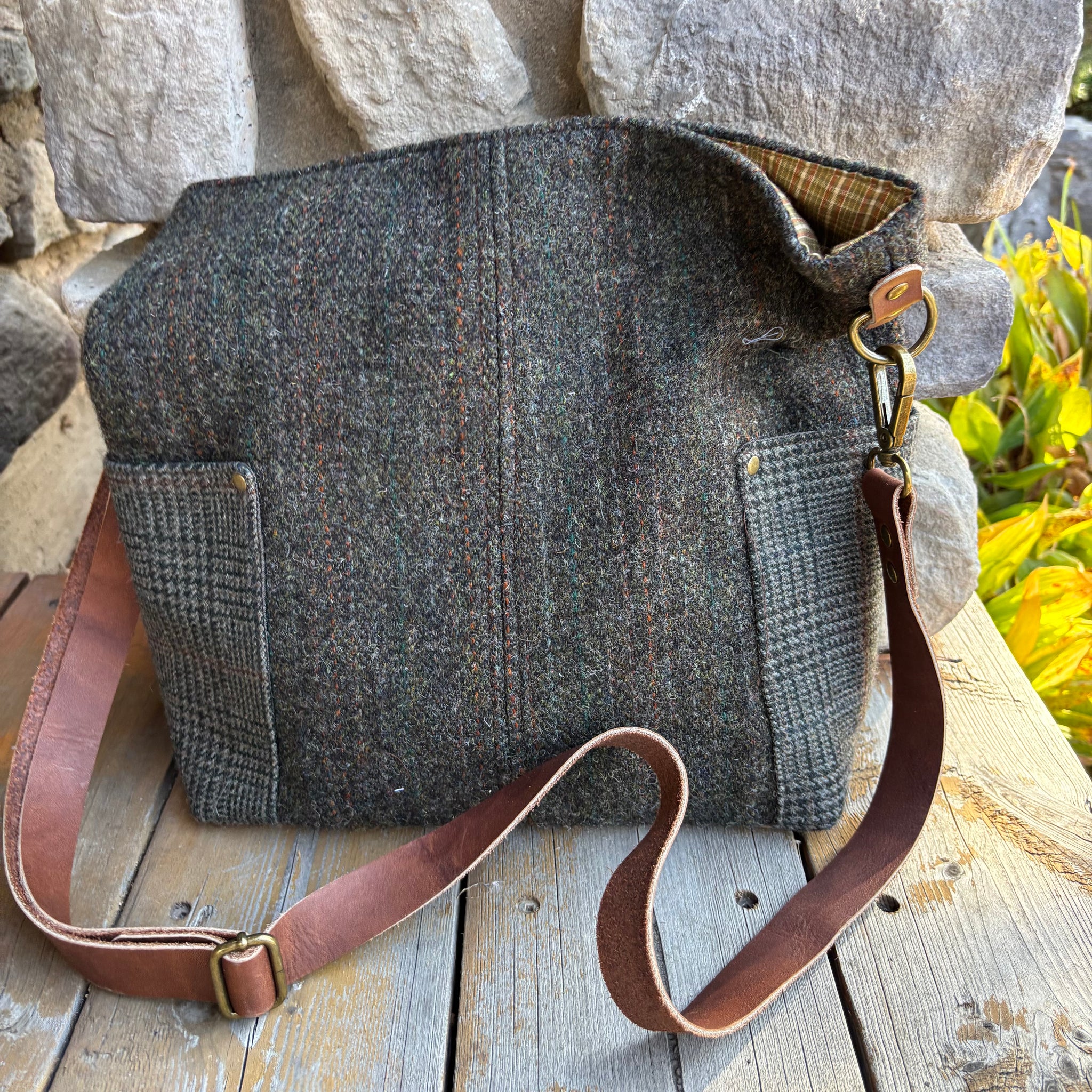 The exterior of every Compass bag is crafted from thrifted wool suit jackets, skirts or other woolly remnants. Two easy-access pockets offer quick storage, while the durable waxed canvas provides a sturdy, water resistant base. Leather tabs, rivets and durable hardware secure the gorgeous leather strap, adding timeless detail. Inside, the bag is thoughtfully designed for your daily essentials—wallet, sunglasses, and a small book—with a zip pocket lined with patterned material and a slip pocket from wool kilts. Versatile and stylish, this crossbody bag is ready for your everyday adventures.