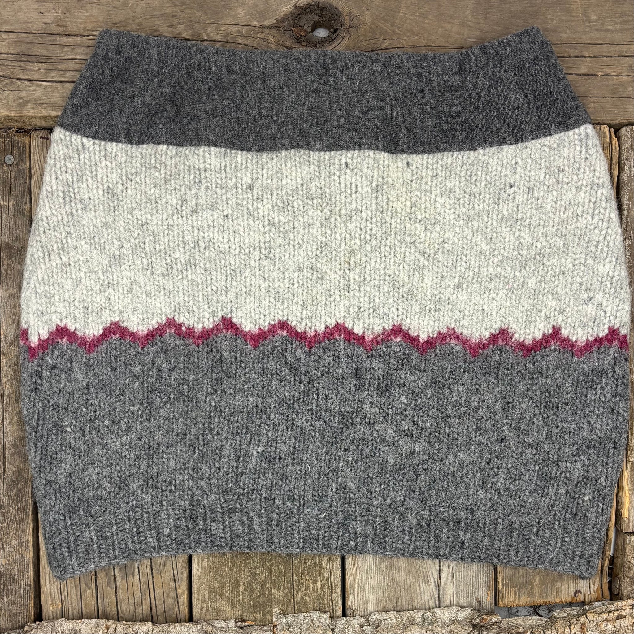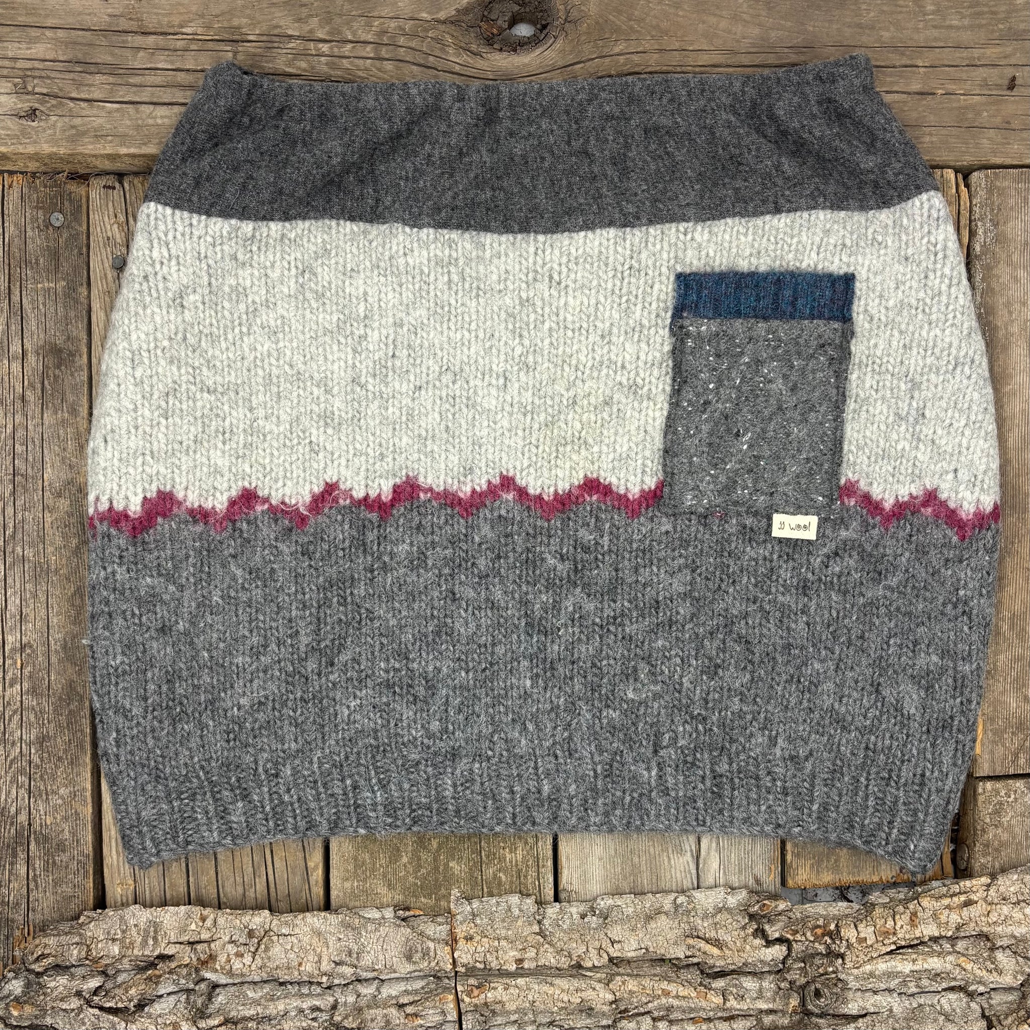 This "all rounder" skirt uses the same Icelandic lopi wool sweater on the front and the back. Soft greys with a touch of cranberry zigzag. The handy patch pocket looks good worn in the front or back.