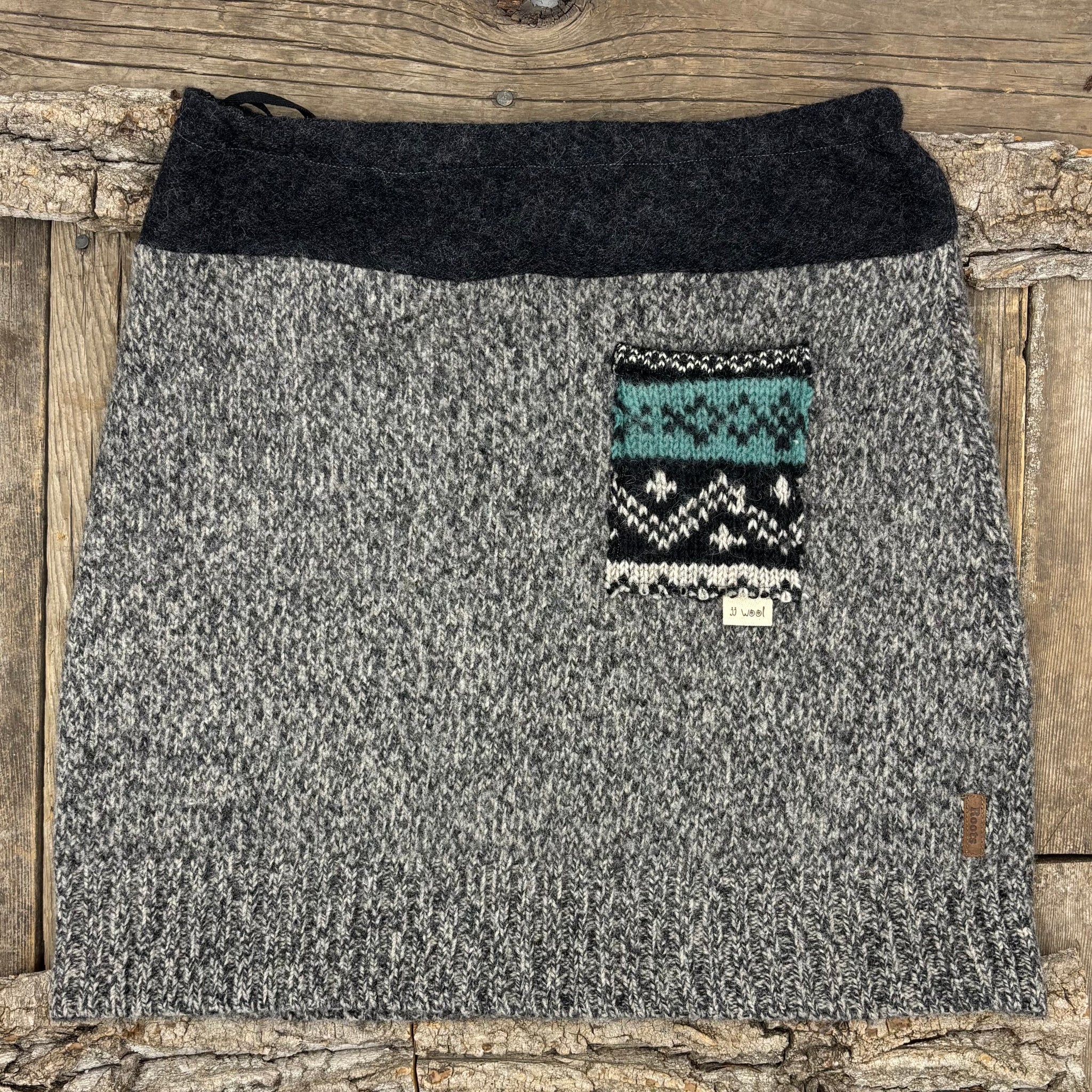 This "all rounder" skirt uses the same classic heathered charcoal/grey sweater on the front and the back.The fairisle knit patch pocket with a touch of green adds interest . Pocket looks good worn in the front or back.