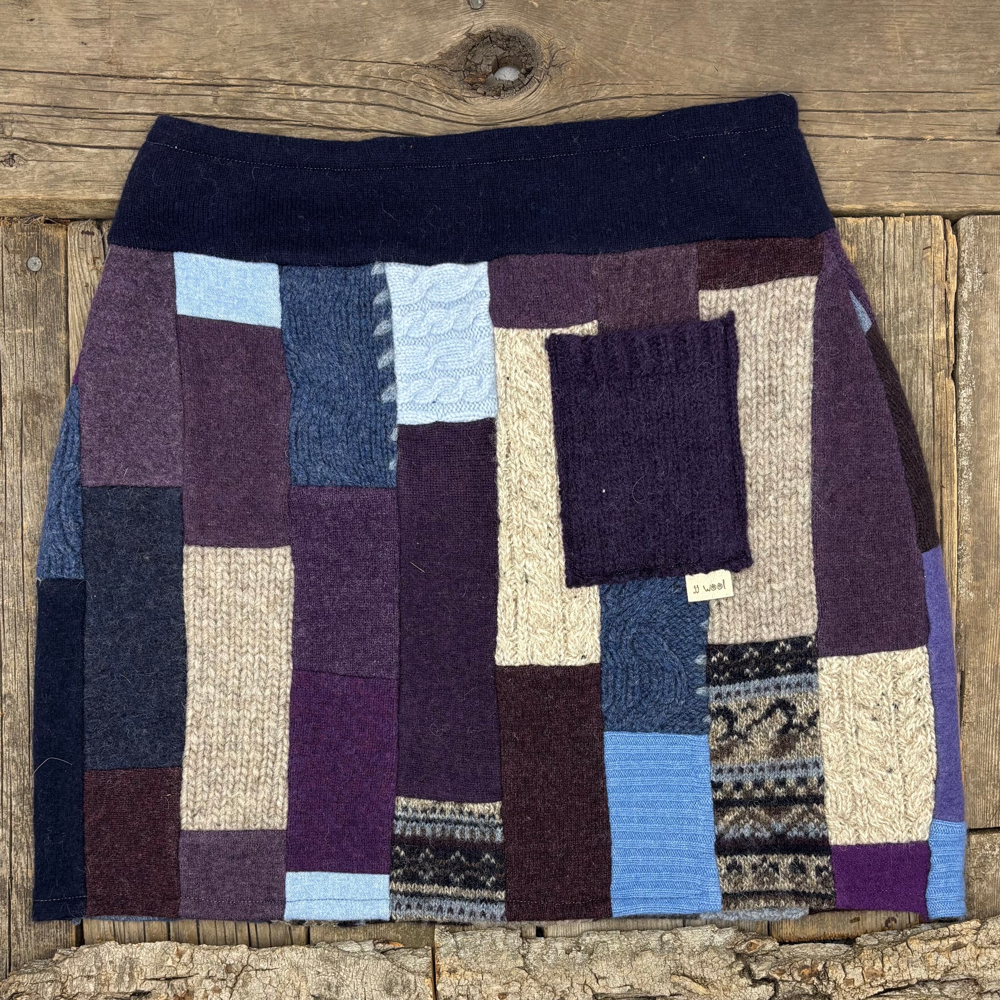 This skirt is for the purple lovers . We know you are out there! Purples, blues and tans are combined and used for the front and back. Lots of textureThe strips are arranged vertically. There is a handy patch pocket that looks equally good worn on the front or the back .