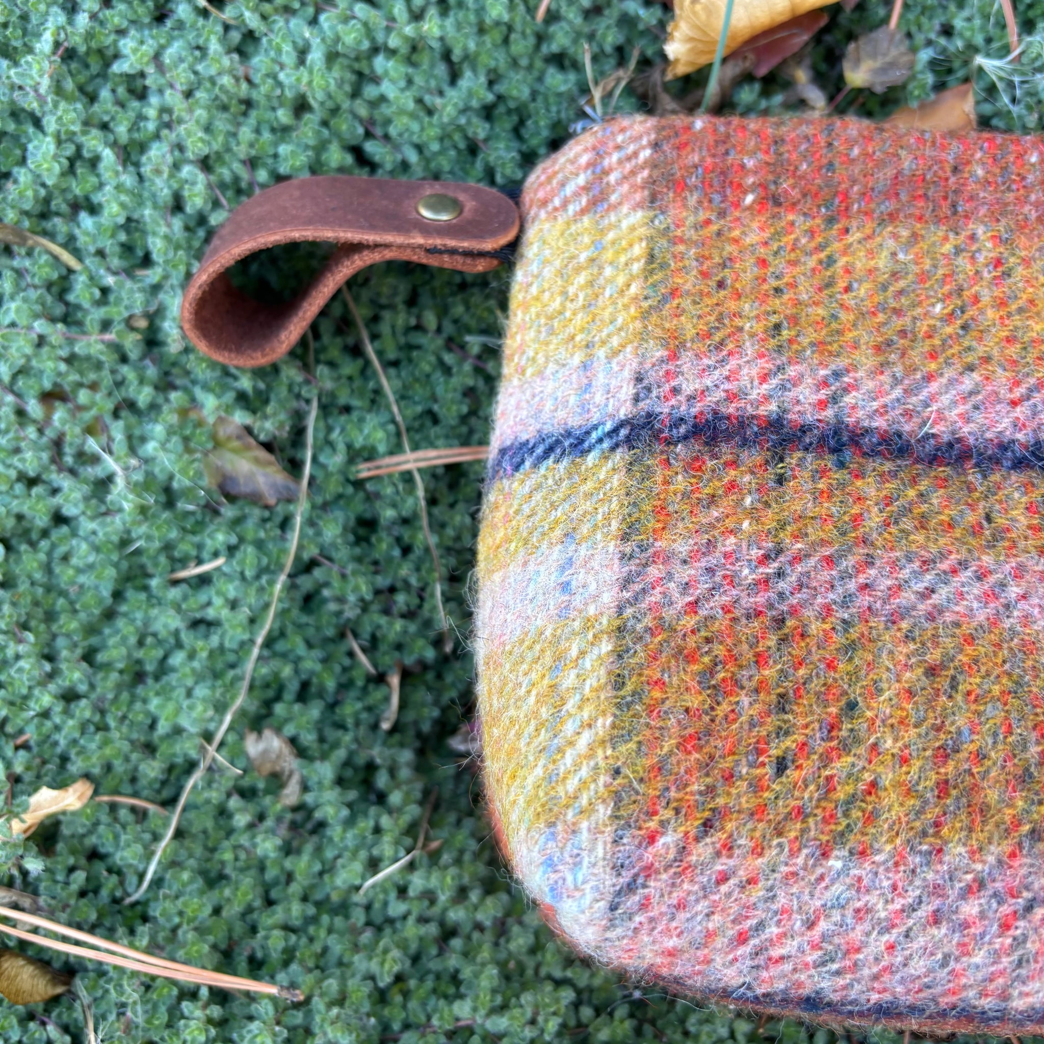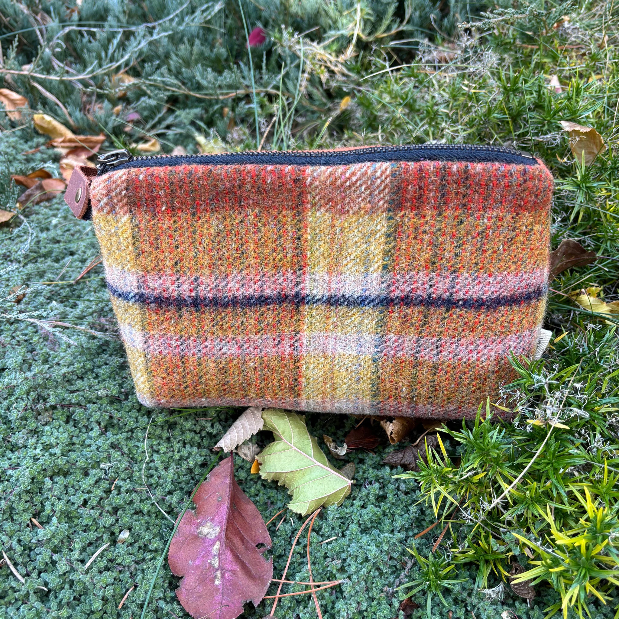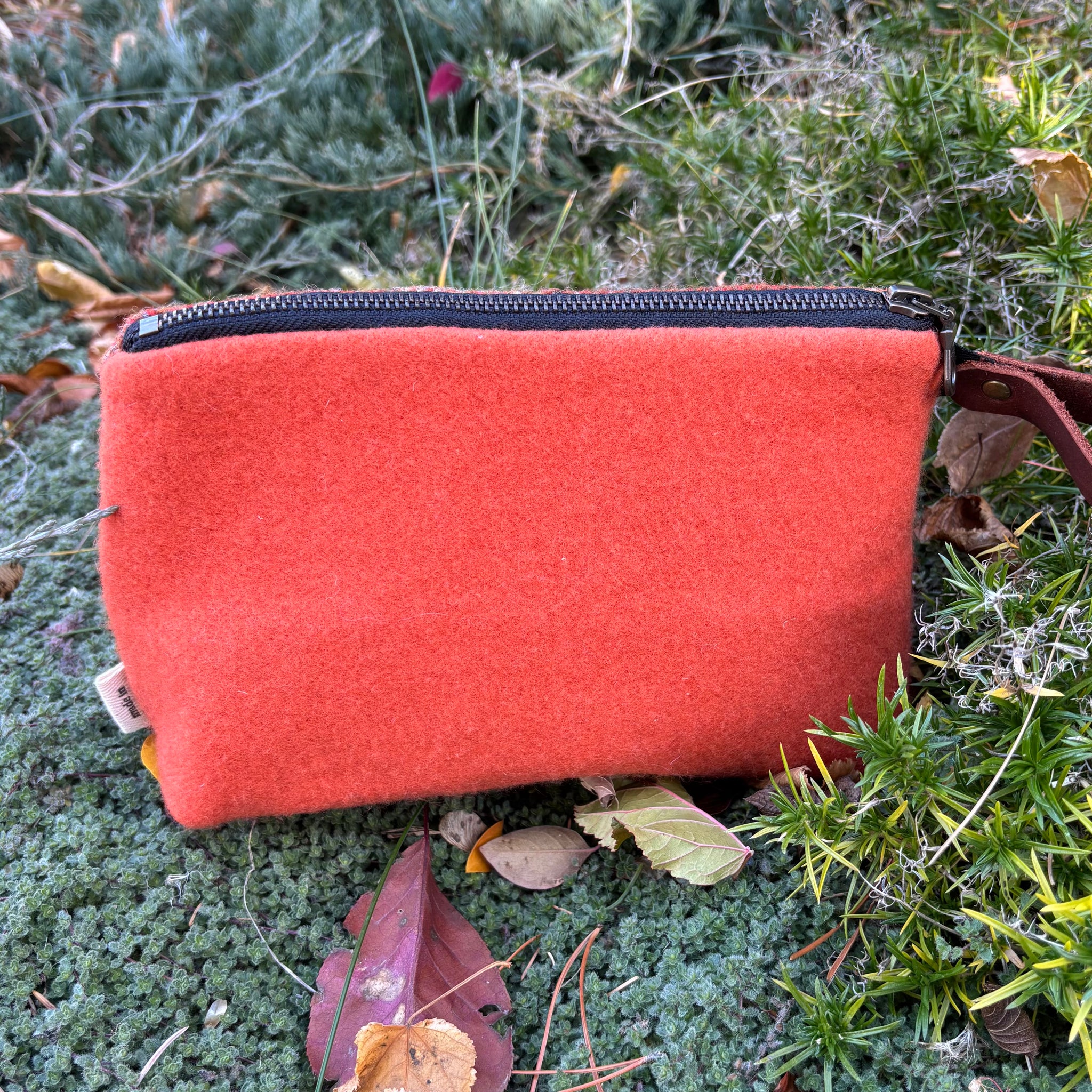 This medium-sized zippered case is made using material from scarves or wool shirts or wool suit jackets or maybe even a wool blanket. The lining is made using souvenir tea towels from all over the world. To keep everything inside we used a zipper and attached a leather pull.
