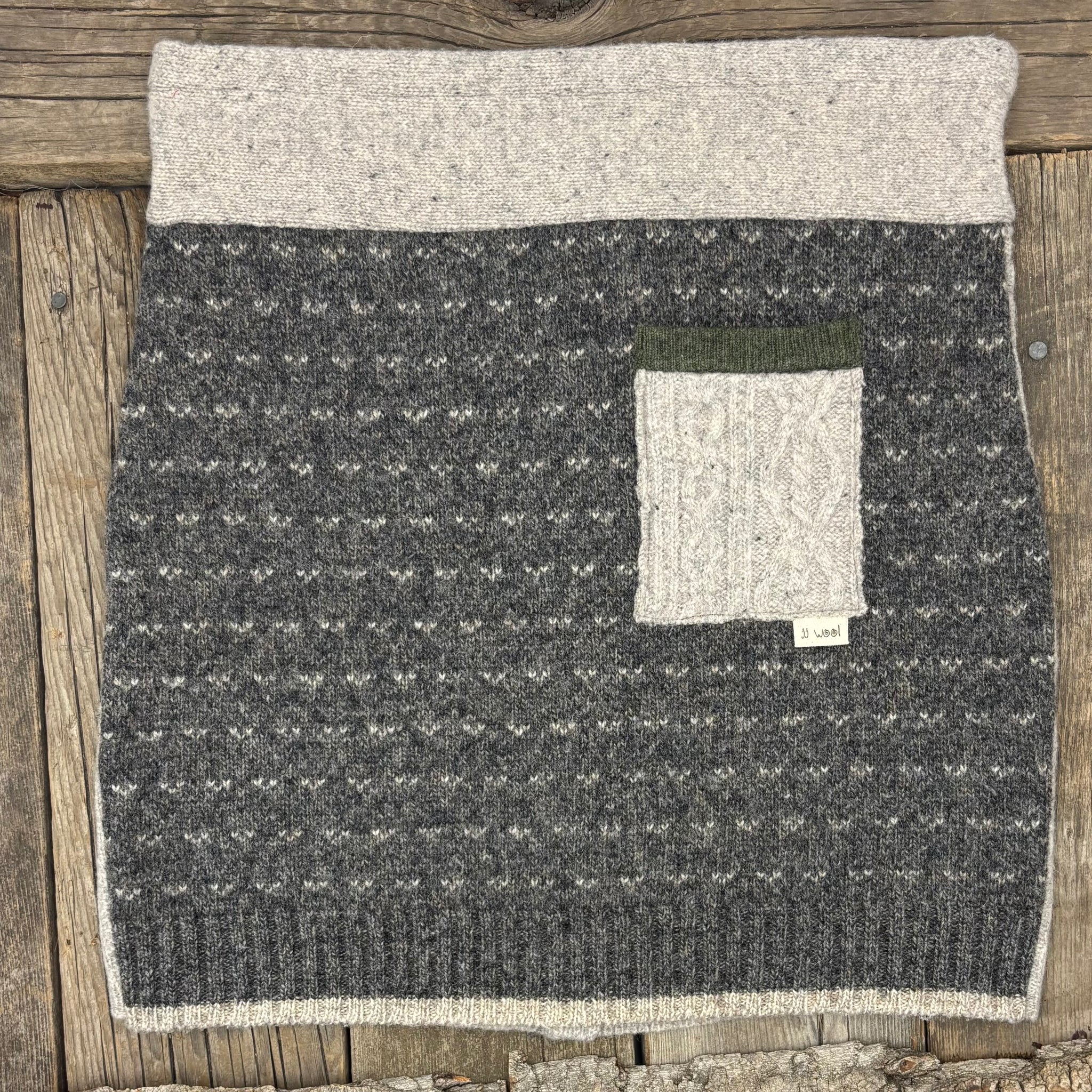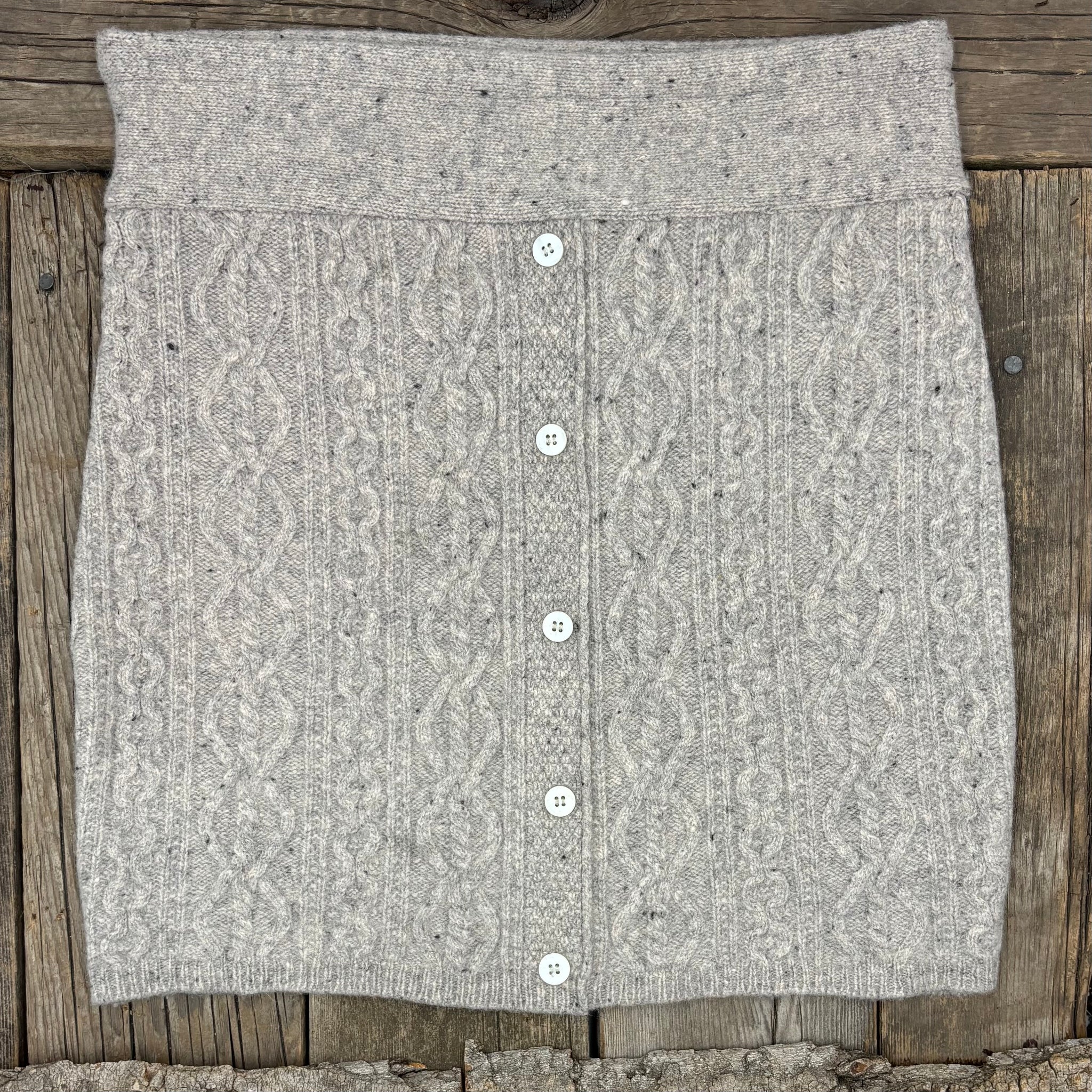 This skirt combines a delicate speckled Irish cable knit cardigan in the front with a striped greige wool sweater on the back . Handy patch pocket from the cabled sweater. Very classic feel.