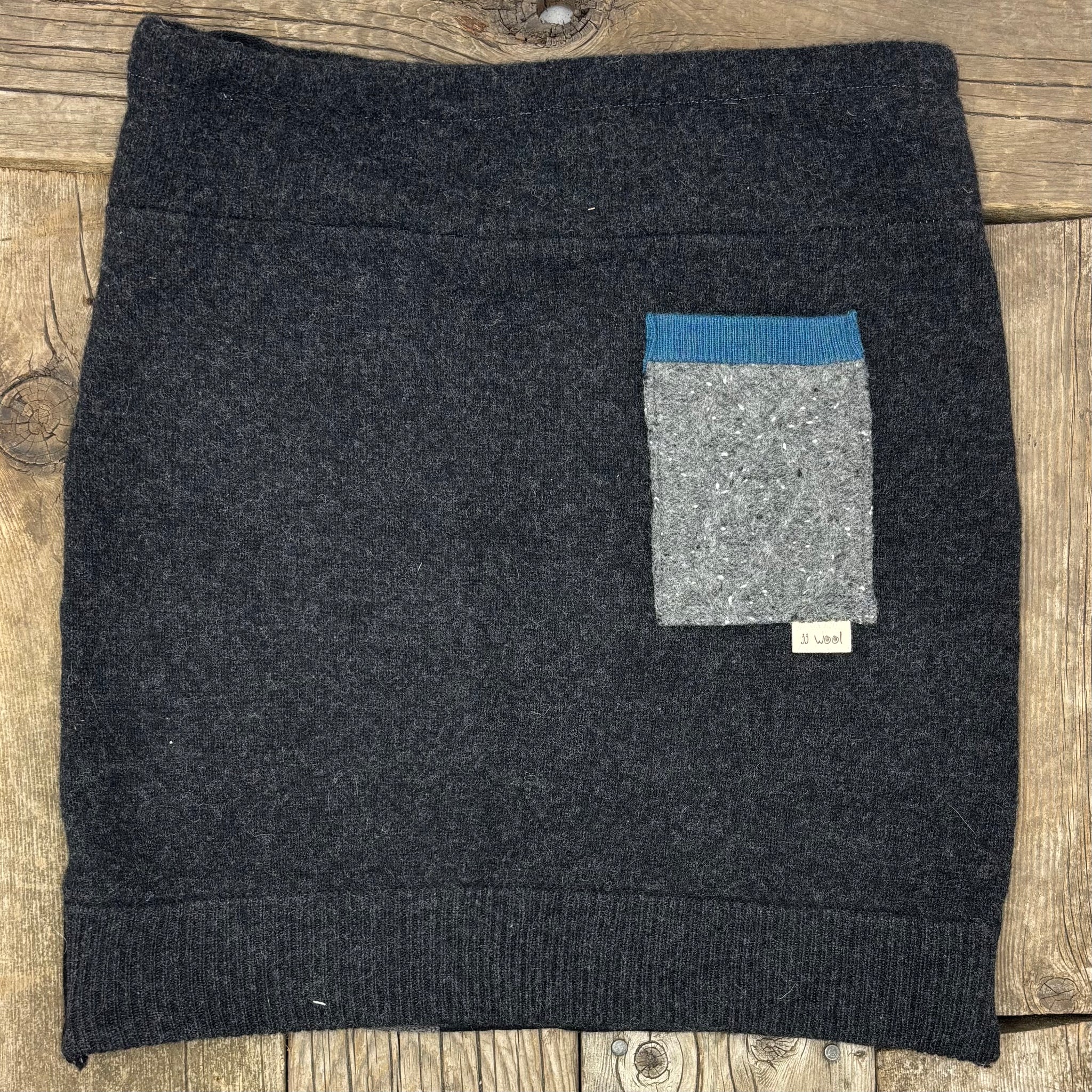 We have pieced together an assortment of black and grey sweaters to use for the front of this skirt. The back is a super soft charcoal knit with the signature handy back pocket. A good basic skirt that could be dressed up or worn casual.