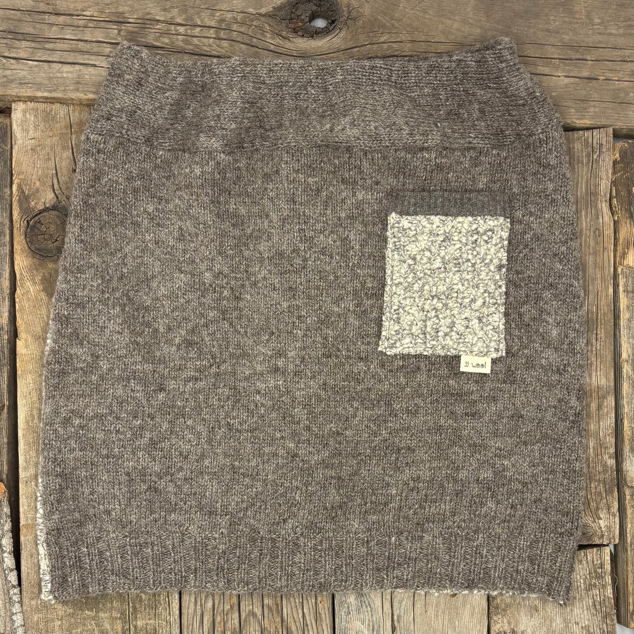 This skirt combines a retro nubbly knit wool cardigan sweater in the front with a handknit greige sweater in the back. Cool buttons down the front and a handy pocket in back. Worn just below the waist, it tends to fall a couple of inches above the knee, shorter if you’re tall, and the drawstring waistband is adjustable.