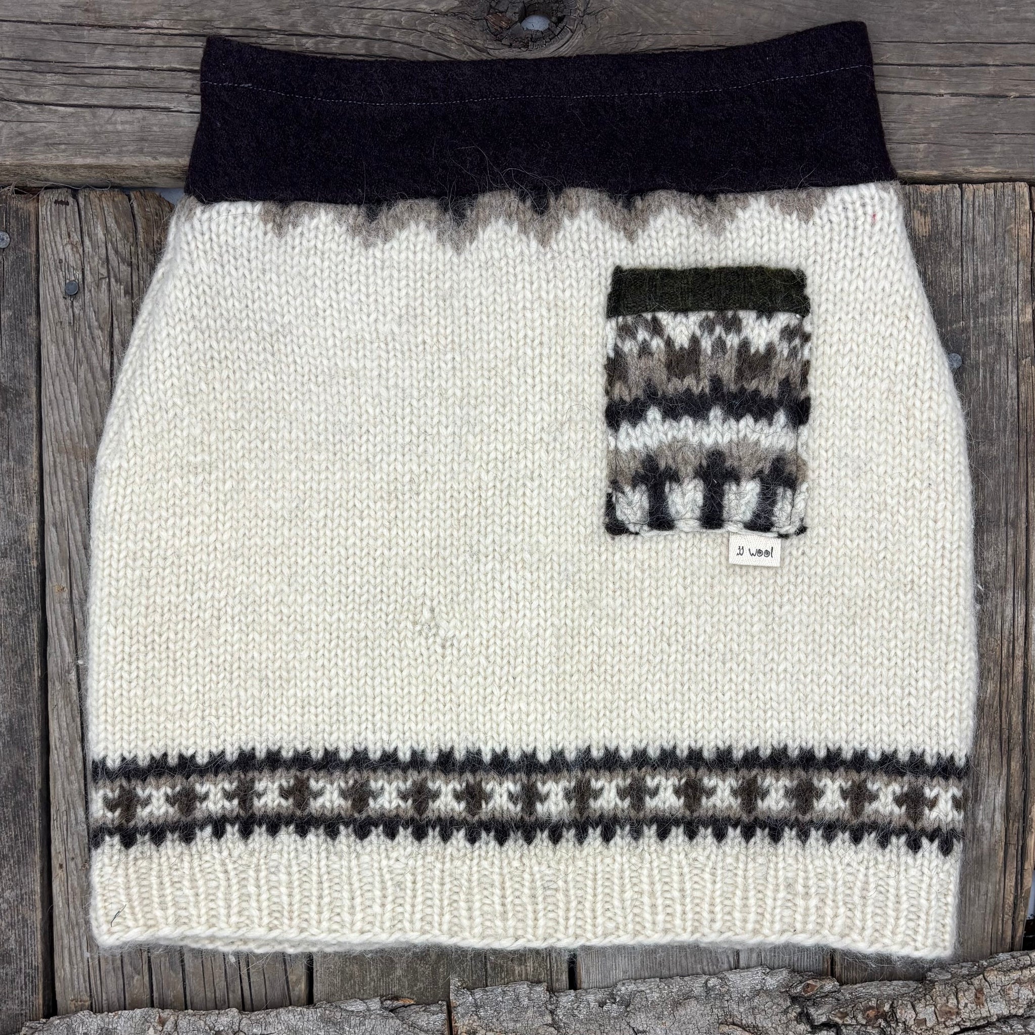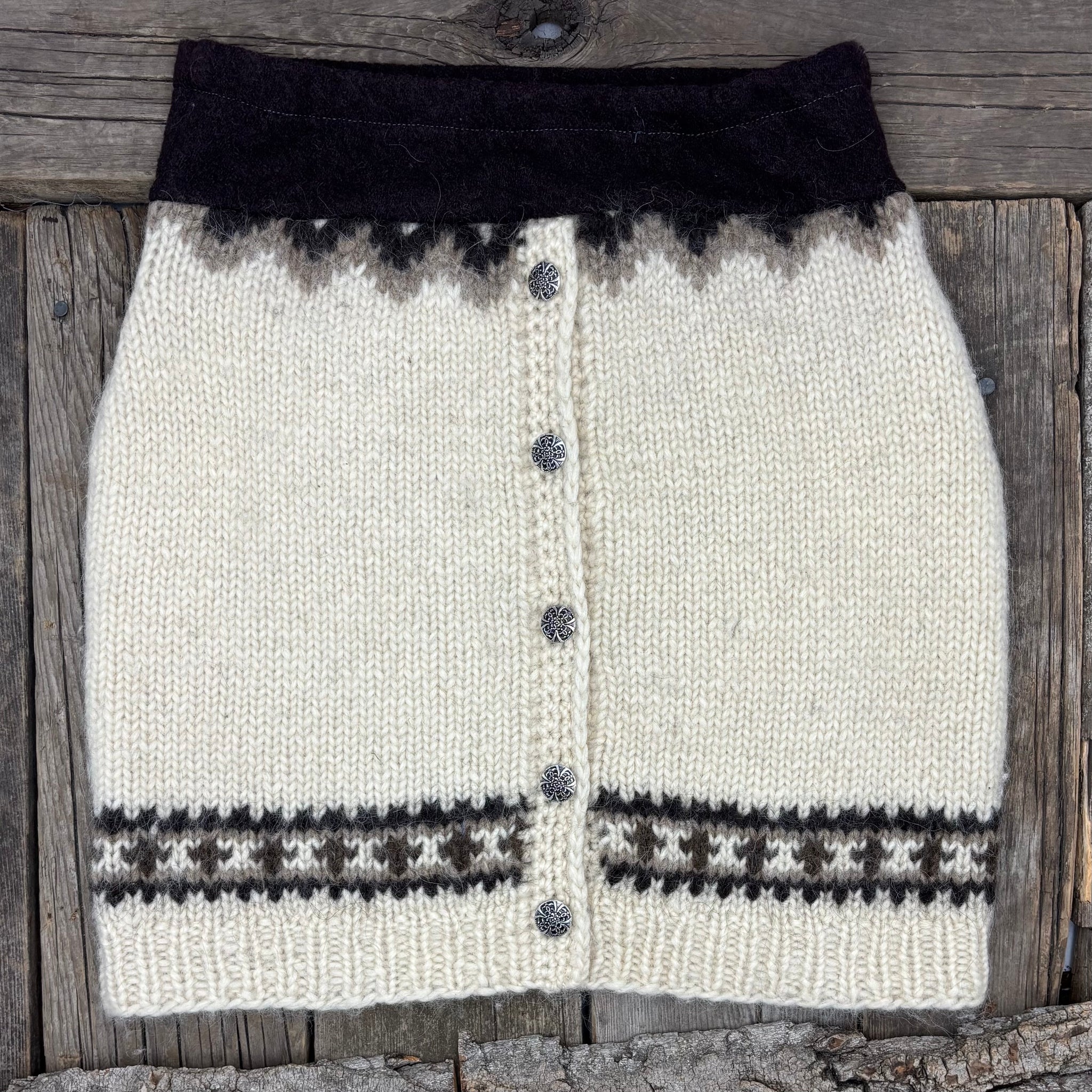 Immediately identifiable as the cardigan that it was, this handknit Icelandic lopi yarn sweater has become a super cute skirt. Silver filigree buttons down the front and a patch pocket on the back. Worn just below the waist, it tends to fall a couple of inches above the knee, shorter if you’re tall, and the drawstring waistband is adjustable.