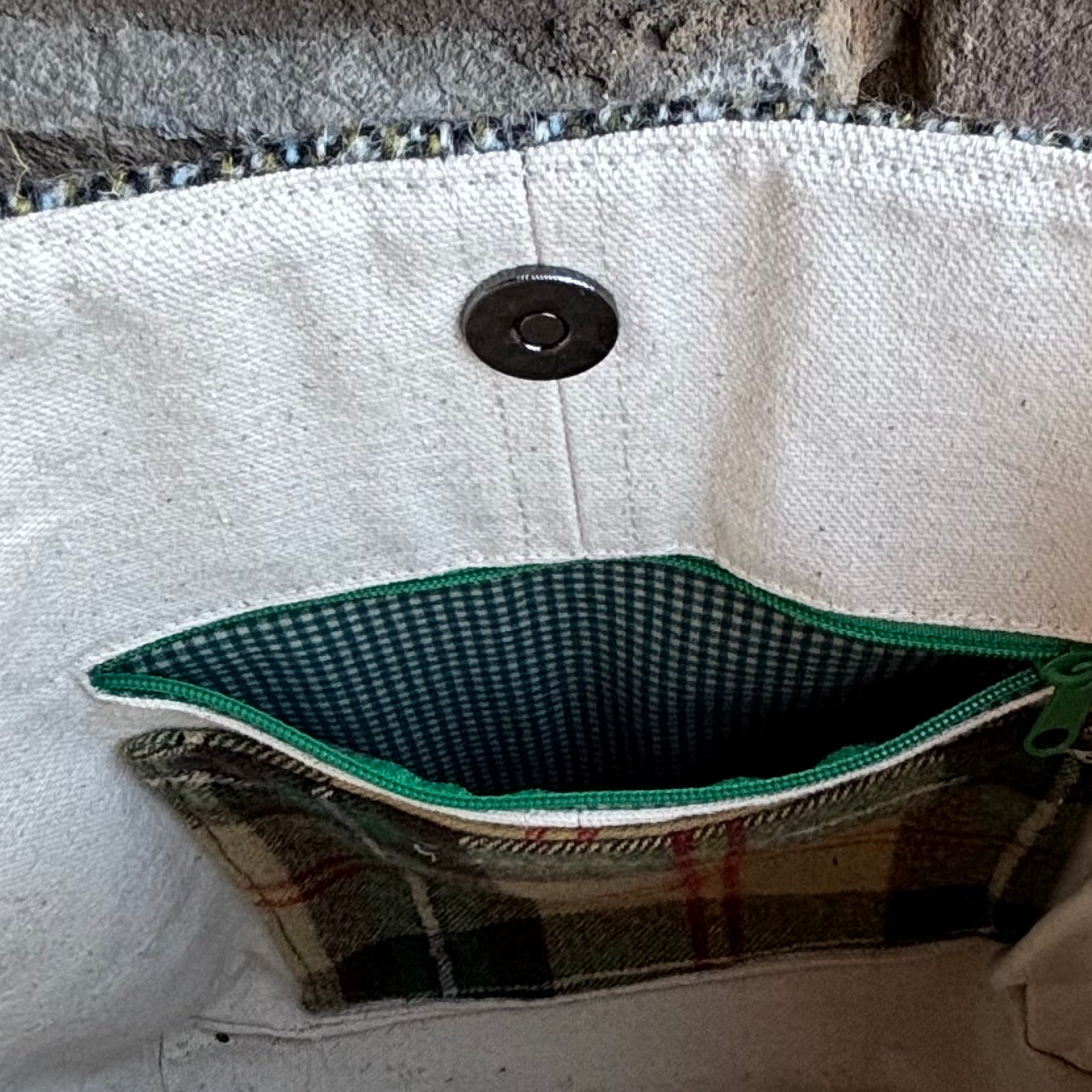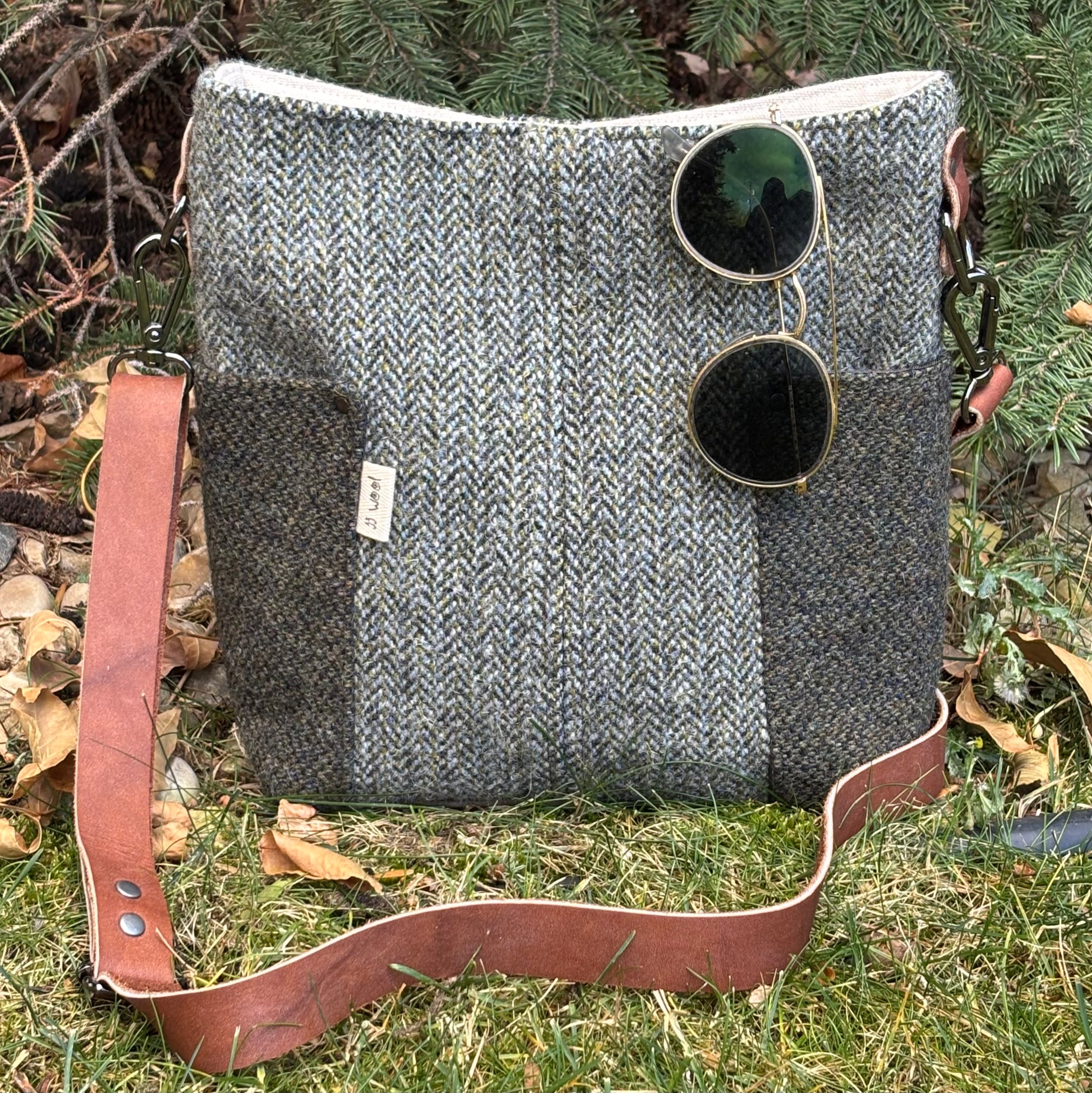 The exterior of each Compass bag is crafted from thrifted wool suit jackets, skirts or other woolly remnants. Two easy-access pockets offer quick storage, while the durable waxed canvas provides a sturdy, water resistant base. Leather tabs, rivets and durable hardware secure the gorgeous leather strap, adding timeless detail. Inside, the bag is thoughtfully designed for your daily essentials—wallet, sunglasses, and a small book—with a zip pocket lined with patterned material and a slip pocket from wool kilts. Versatile and stylish, this crossbody bag is ready for your everyday adventures.
