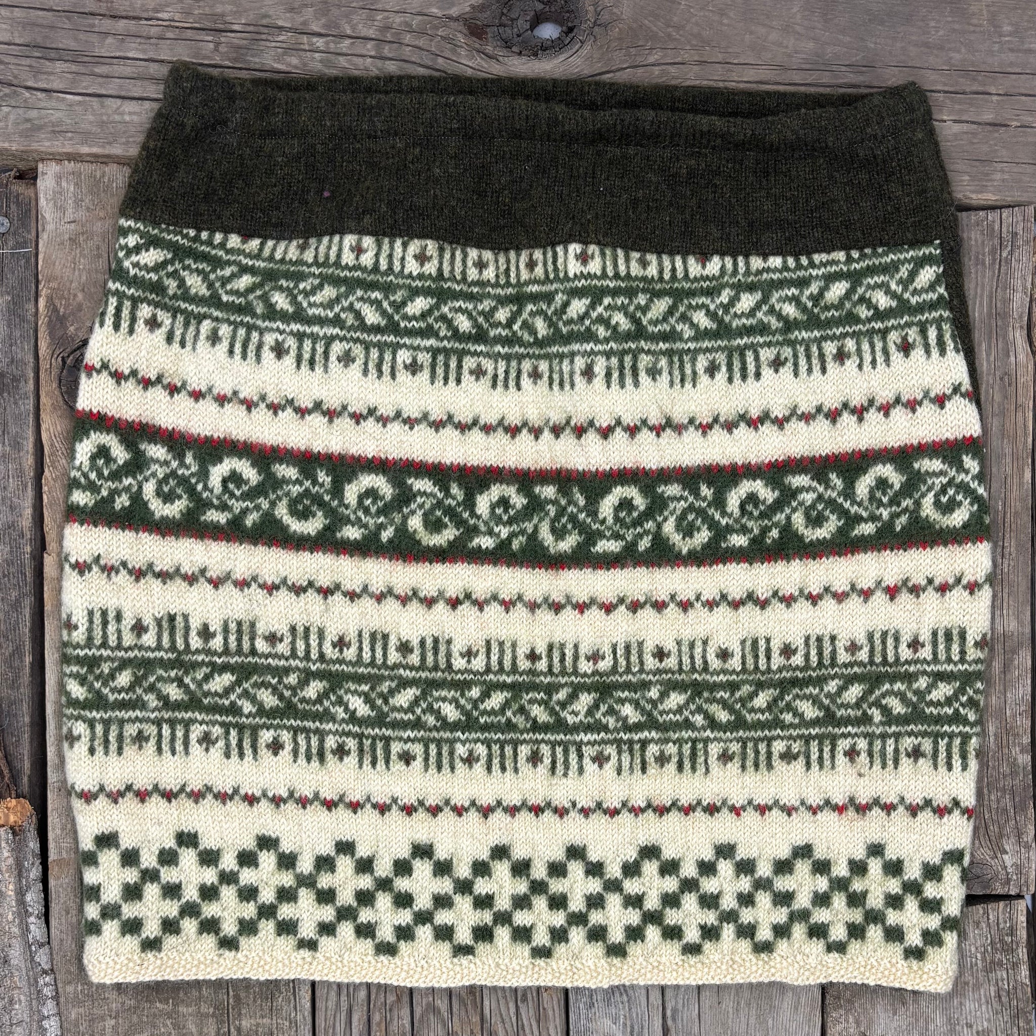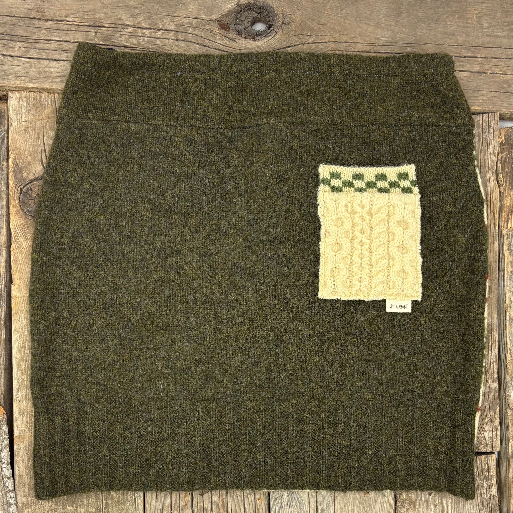 The front of this skirt is a cream and green with a dash of red fairisle knit sweater. The back is a moss green knit with a cabled handy pocket. Worn just below the waist, it tends to fall a couple of inches above the knee, shorter if you’re tall, and the drawstring waistband is adjustable.