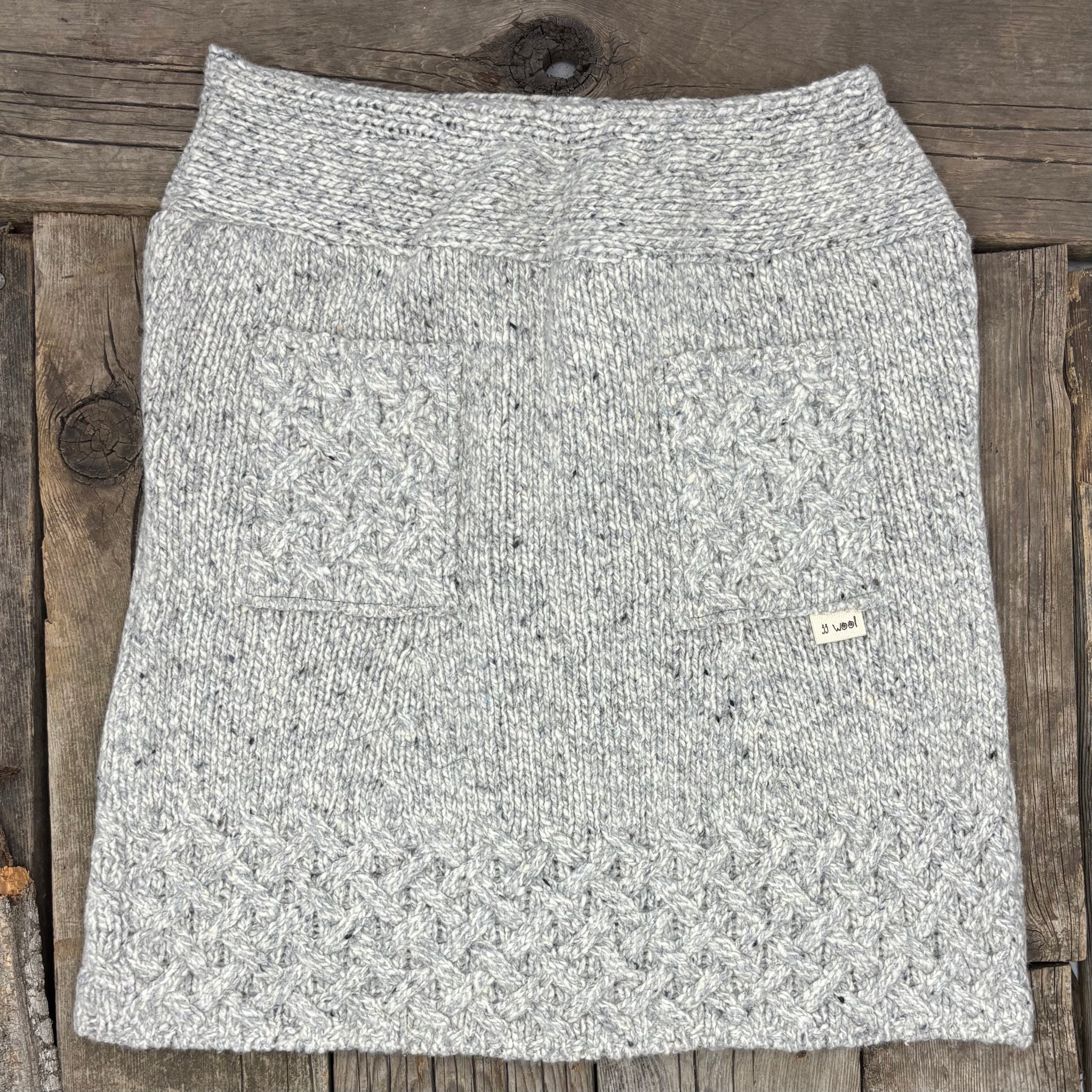 This skirt uses a soft grey Irish cable knit sweater in the front and back. Mother pearl buttons down the front and 2 handy pockets in back .Worn just below the waist, it tends to fall a couple of inches above the knee, shorter if you’re tall, and the drawstring waistband is adjustable.