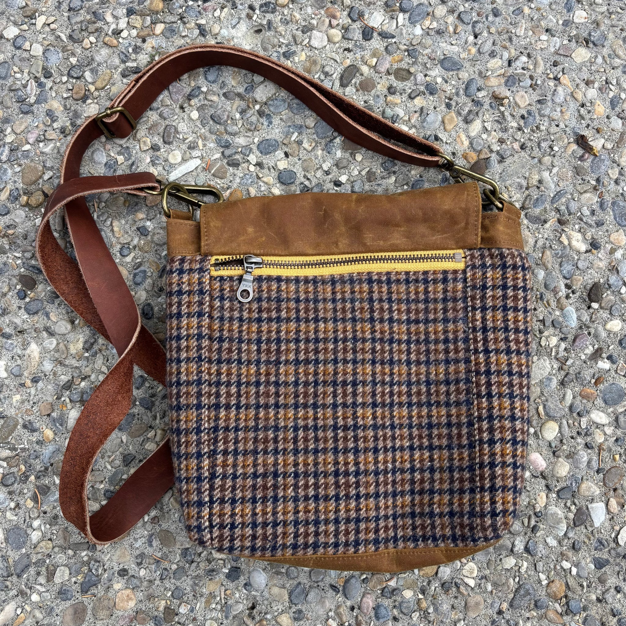 This Sequoia Satchel is a messenger-style cross body bag made using lots of waxed canvas for durability and water resistant strength. We’ve chosen some our favourite wool skirts and suit jackets to compliment the waxed canvas inside and out and we’ve even used some small kilt pieces for the inner slip pocket.