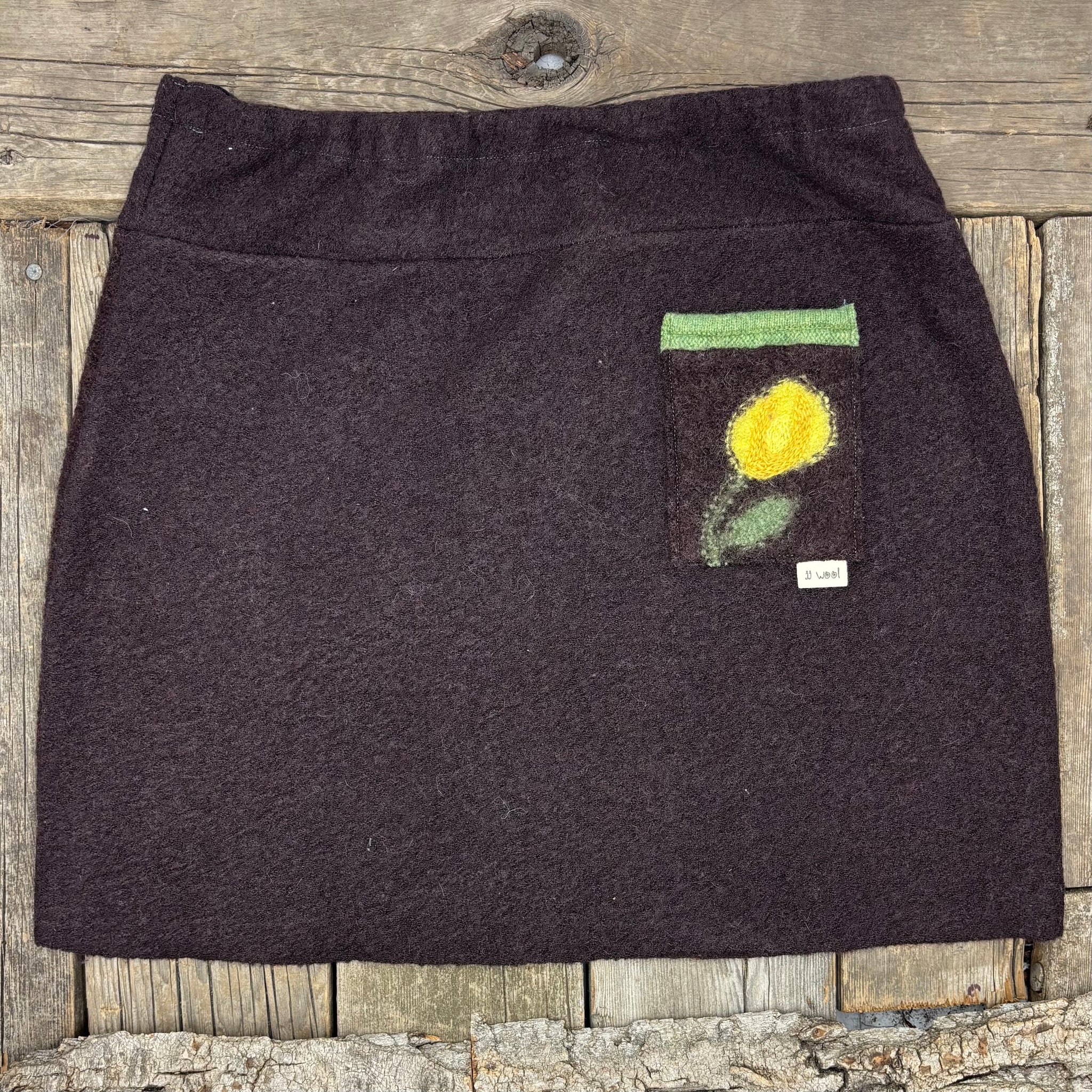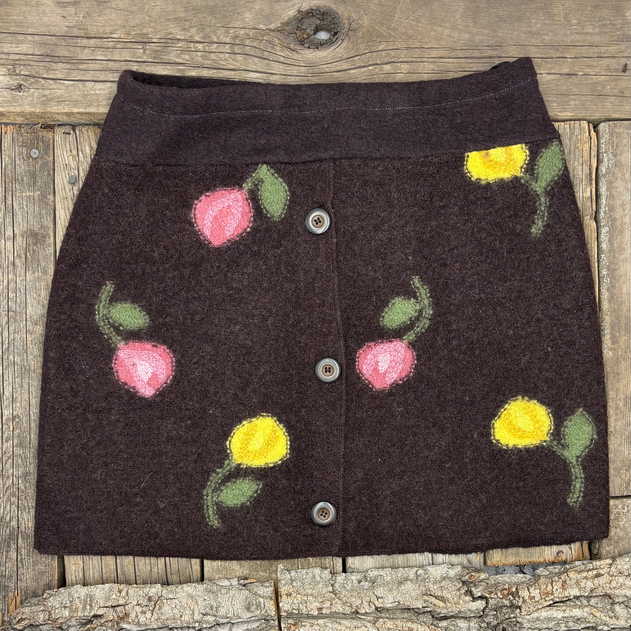 We were able to create two truly unique skirts from this chocolate brown boiled wool jacket. This one has the buttons down the front among the pink and yellow embroidered garden flowers. The back is a solid brown boiled wool featuring another flower from the garden on the patch pocket